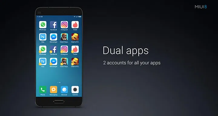 MIUI 8 introduces two new features that will enable that called Dual Apps and Second Space. Dual Apps lets users create two accounts for your all apps. This means you can have separate instant messaging apps for different contacts, say, one for friends and another for work.