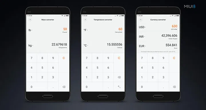MIUI 8's calculator is now much more intelligent and useful. Apart from doing regular mathematic operations, it can also do conversions. Users simply select what kind of conversions they want to do, and the calculator will take care of it. It can convert units like distance, speed, temperature, time and more. It can also gather real-time currency information and do currency conversions.