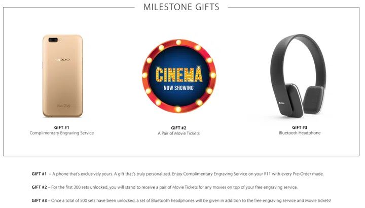 If enough pre-orders are placed for the phone on Oppo's website, all pre-order customers will be able to unlock 'milestone gifts'. Right now, all customers will receive a complimentary engraving service on the back of their R11. Oppo Singapore has purchased two engraving machines, and the engraving will be done on site at Oppo's flagship store at Suntec City on 1st July. If 300 pre-orders are placed, the first 300 customers will receive a pair of movie tickets, and if 500 pre-orders are placed, the first 500 customers will also receive a pair of Bluetooth headphones. Note that these pre-order gifts are exclusive to customers that pre-order the R11 through Oppo's website.