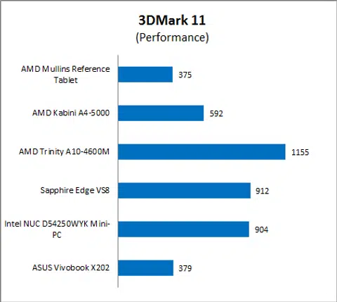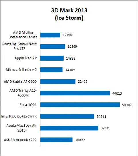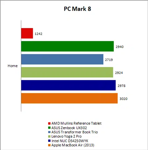 That said, the discrepancy in results can be mainly attributed to the fact that Mullins reference tablet is being faced off against notebooks with more powerful and higher TDP mobile processors. For instance, the ASUS Zenbook UX302 and ASUS Transformer Book Trio are both powered by dual-core Core i5-4500U processors that have a rated TDP of 15W, much greater than the A10 Micro-6700T APU. which has a rated TDP of just 4.5W. Unfortunately, we don't have PCMark 8 results from tablet-class Windows systems to put up a better comparison.