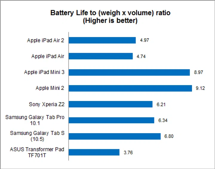 To put the earlier battery life and power consumption figures into perspective, let's look at our portability index, which compares battery life to the device' volume and weight. Apple's iPad Mini tablets are the highest score bunch here, but that is because they only have 8-inch displays, while the rest of the tablets have 10-inch displays. And again, the new iPad Air 2 is letdown by its short battery life as it is outscored by rivals from Sony and Samsung. So while general performance is definitely one of the iPad's strong suits, we cannot say the same for battery life and portability.