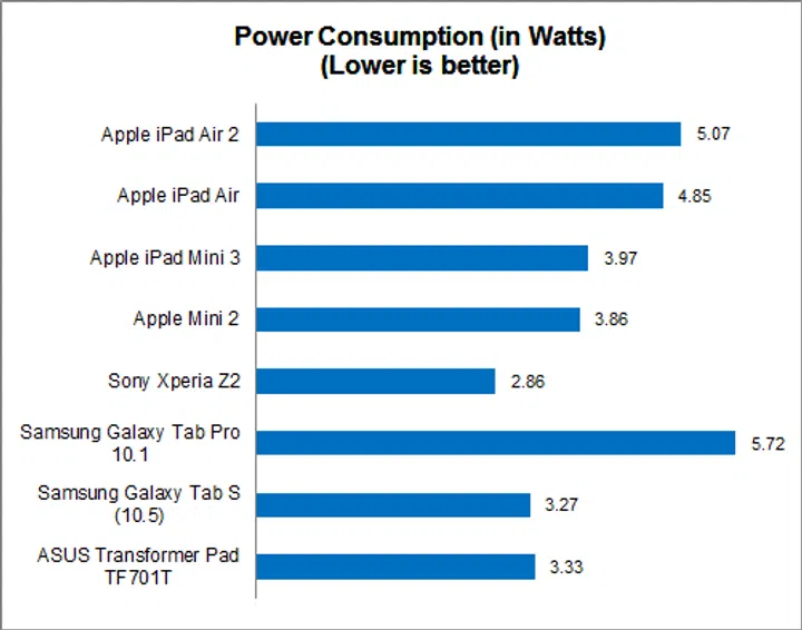 And if we look at the power consumption charts, the iPad Air 2 is clearly one of the more power hungry tablets. We had expected the new A8X processor to consume more power than the older A7 processor, but it may surprise you to find that it actually consumes around 4% more power - but it offers loads more in terms of performance, so the tradeoff is reasonable, we think. Hence, if anything, the smaller battery in the iPad Air 2 is to be blamed for its slightly lackluster battery life.