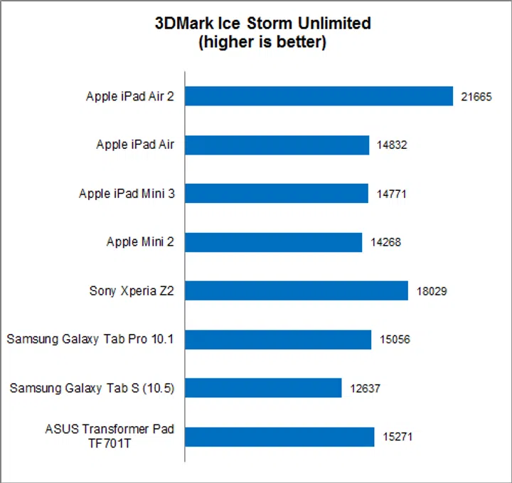 Again, the iPad Air 2 blew away the competition by recording a score of 21665 points. Compared to the iPad Air, this is over 45% greater. Also, nothing from the Android camp came close to challenging it. And predictably, the iPad Mini 3 managed the same score as the iPad Mini 2.