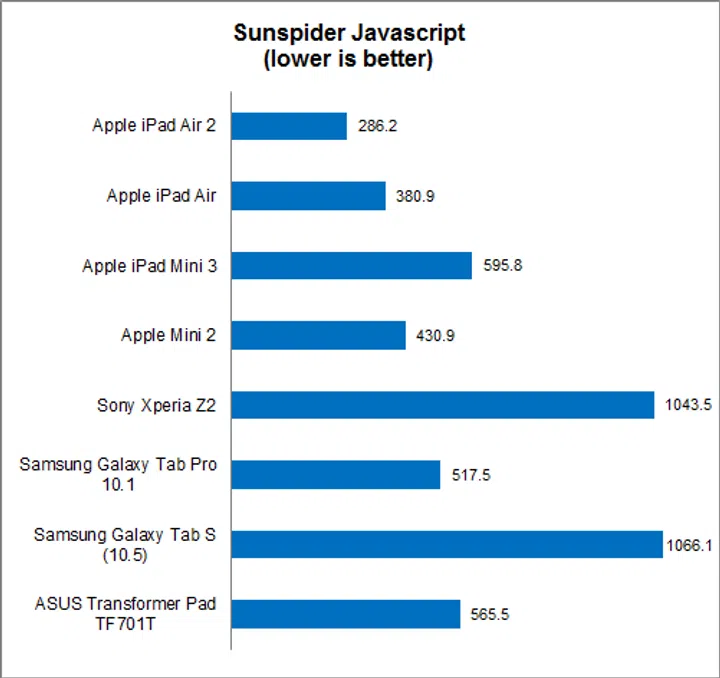 Apple’s iPads have traditionally been strong performers on this benchmark and we were expecting the new iPad Air 2 to blow away the competition, which it did. Its timing of just 286ms is the lowest we have ever recorded and was exactly what we had expected from its new A8X processor. The new iPad Mini 3 was underwhelming as it was slower than the iPad Mini 2 - perhaps because of the additional background resources required for its new Touch ID sensor.