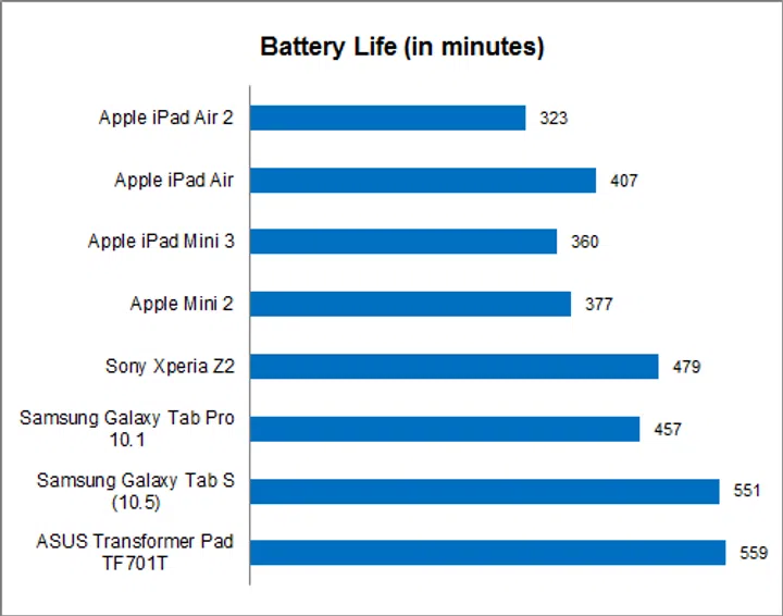The new iPad Air 2 has a smaller battery compared to the iPad Air and this has affected battery life quite drastically. In our tests, we found that the newer iPad Air 2 lasted over 80 minutes shorter - that's more an hour. As such, its recorded battery lifespan is the shortest amongst comparable tablets. And just as we had expected, the new iPad Mini 3 lasted just about as long as last year's iPad Mini 2.