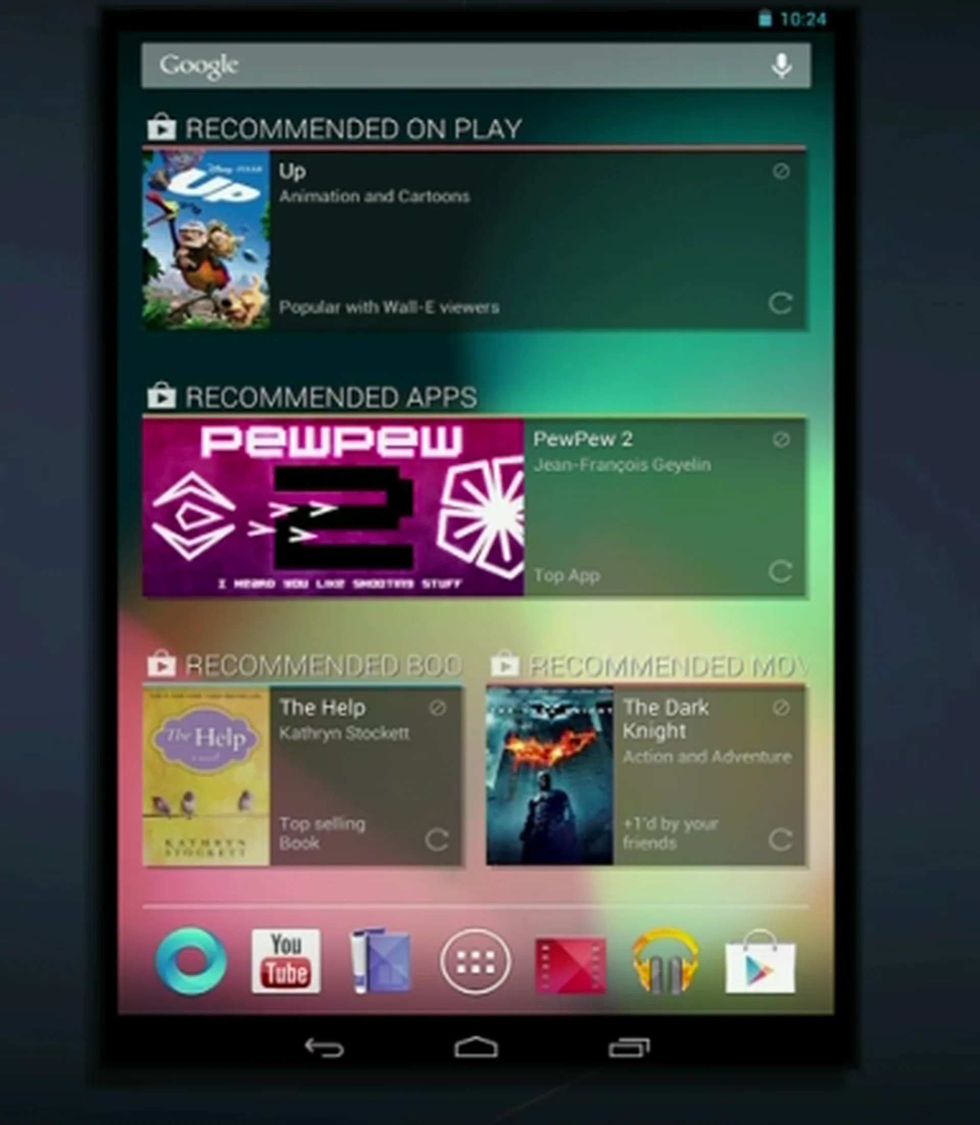 A recommendation engine is built into the new intelligent widgets, which recommend apps, books and movies based on your interests. According to Google, they "will get smarter and more accurate as you use them". There is a music widget that functions like Shazam - it automatically identifies the song playing on the radio and directs you into the Google Play Store for purchasing.