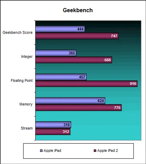 Using Geekbench 2, we found that the iPad 2 is significantly faster than the iPad, and this comes as no surprise. Having additional RAM also means that when apps get minimized, they don't get forced to close (if they support the iOS multi-tasking API), which also means your apps feel snappier and load much faster.