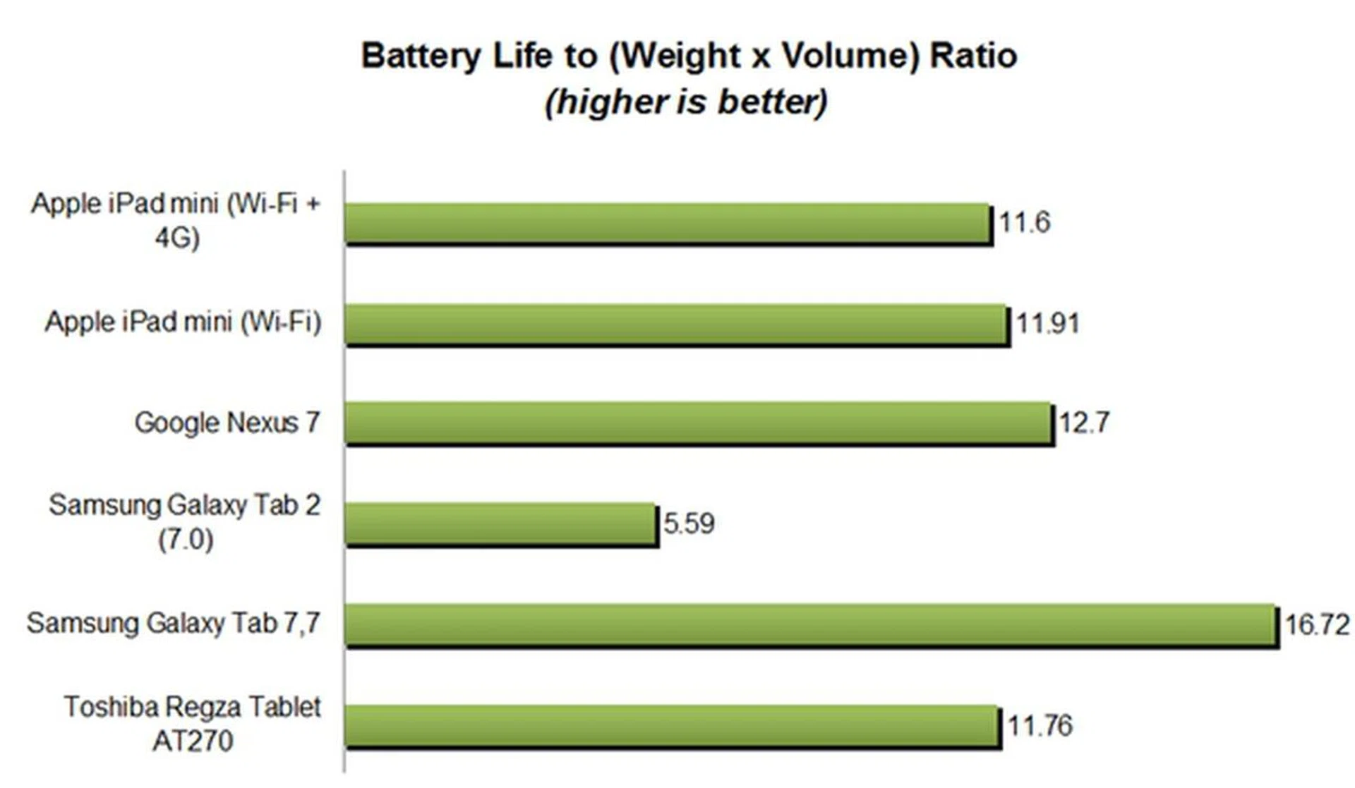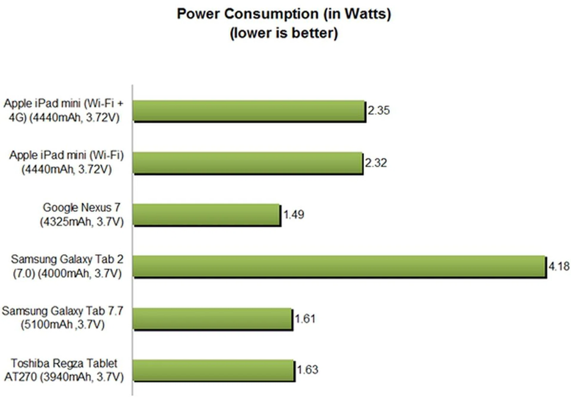 Based on our battery test, the difference between the battery mileage of the two models of iPad mini is minuscule (6 minutes). Power consumption is slightly higher at 2.35W, which also led to a small drop in the Portability Index.