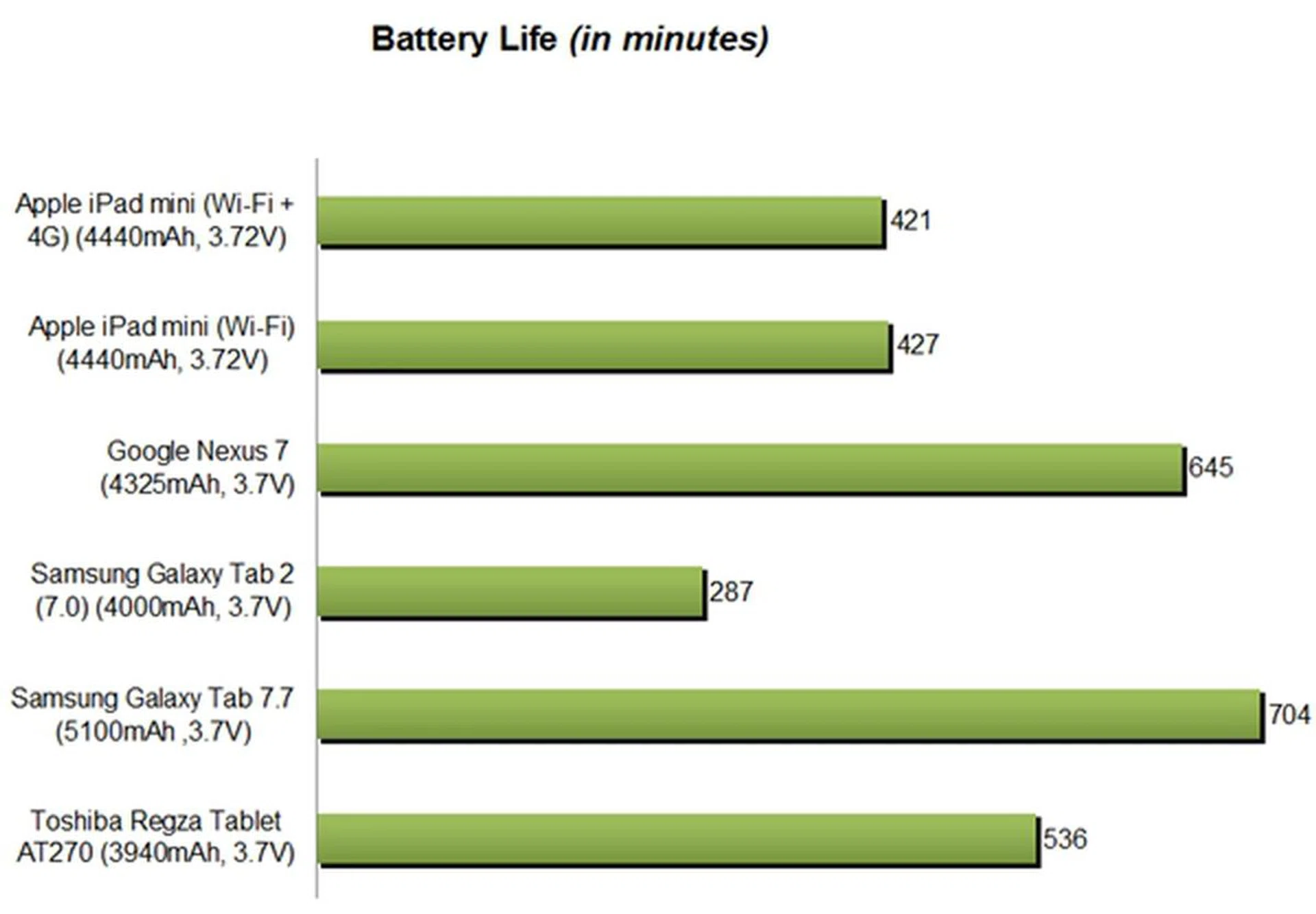 Apple rates the battery life of the cellular model to be about 9 hours of web browsing using a cellular data network. We ran the iPad Mini on an intensive battery test, which involves a video with a resolution of 1280 x 720 pixels being looped on the unit. The test is performed under specific parameters such as:-
