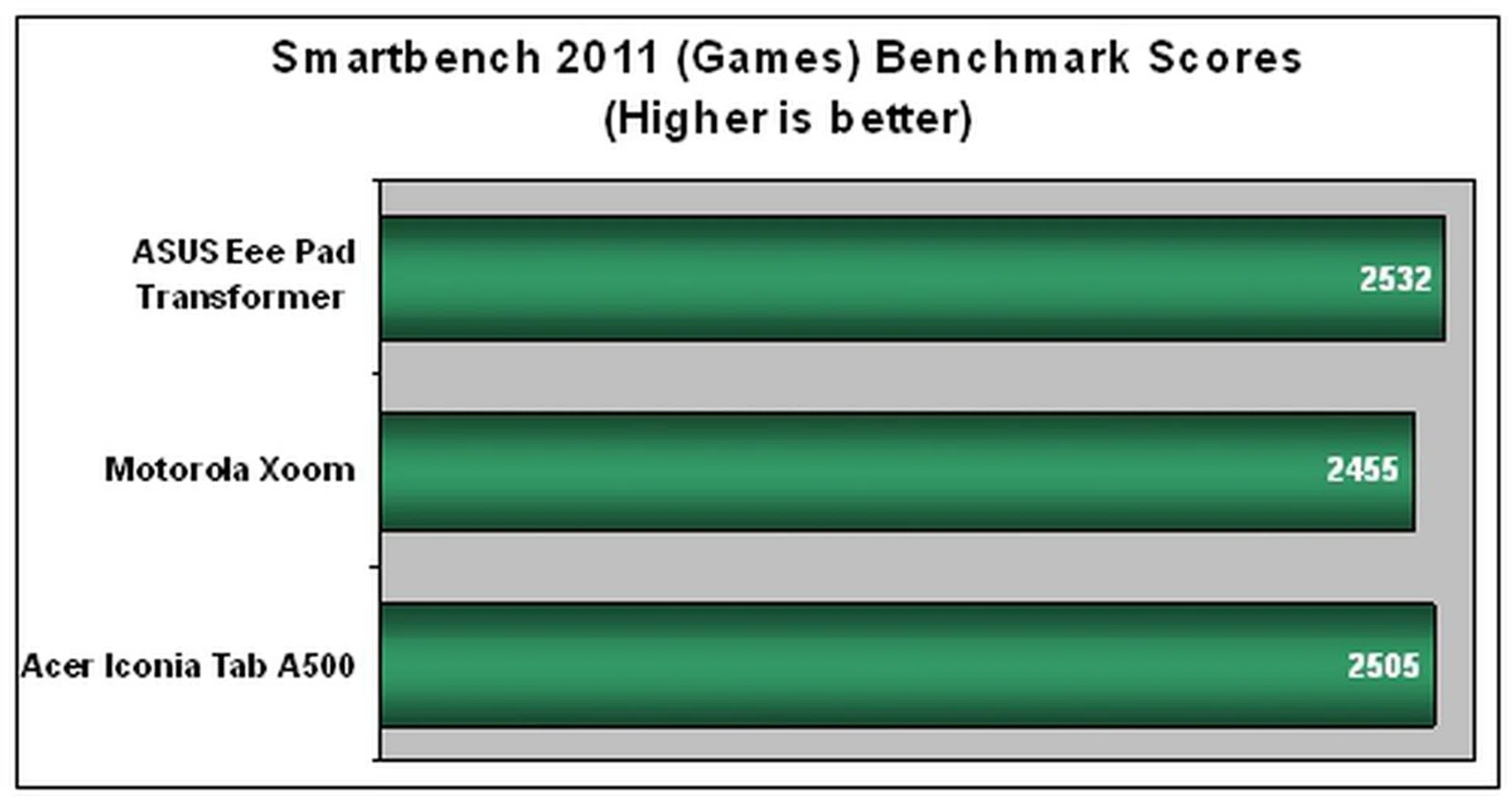 You would have noticed that Honeycomb tablets these days usually have similar hardware specifications. The ASUS Eee Pad Transformer is no different from its Honeycomb peers, the Motorola Xoom and the Acer Iconia Tab A500. It comes with the NVIDIA Tegra 2 dual-core 1.0 GHz processor and 1GB of RAM. In this section, we pit the Transformer against the Motorola Xoom and Acer Iconia Tab A500 to see how it fares in the following benchmarks: