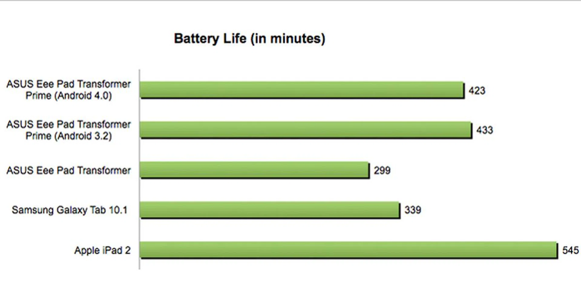 Editor's note: we have since updated our tests results for the Transformer Prime with Google Android 4.0 loaded onto it. The above charts reflect the findings from our tests, which were conducted with the same test parameters. Considering that a slight dive of eight minutes in the battery performance is insignificant, we concluded that Android 4.0 has no impact on the battery life of the device. We also found no differences in the battery longevity during our day to day usage of the Android 4.0-powered Transformer Prime.