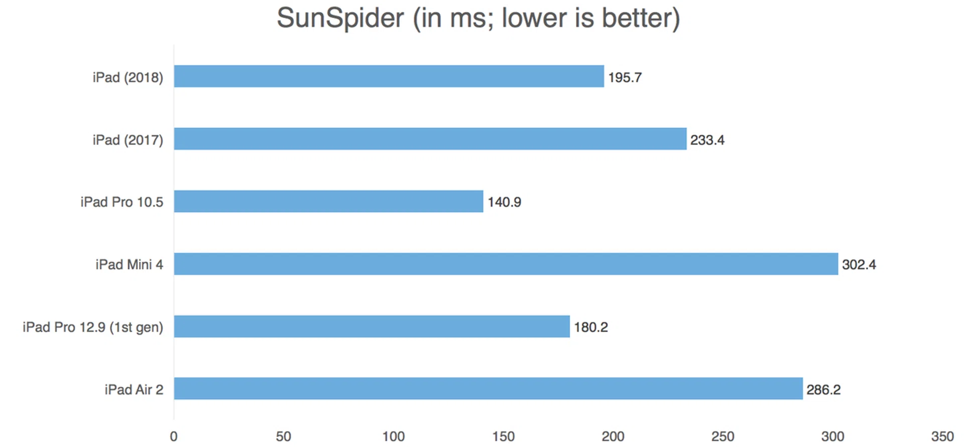 Thanks to the A10 Fusion processor, the new iPad is markedly faster than last year’s model. Take a look at the graphs below. It was about 15% faster on SunSpider and scored over 27% more on 3DMark.