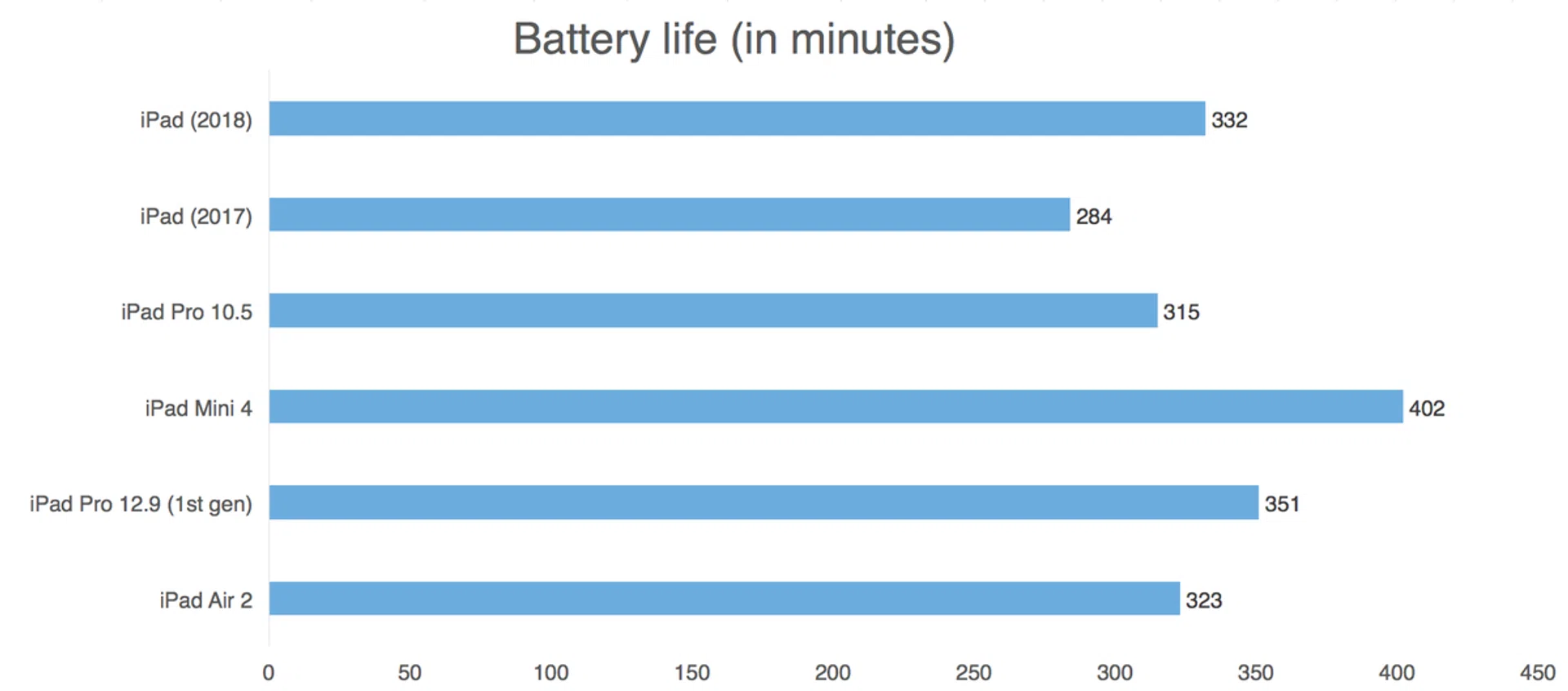 Pretty good. In our tests, we found that the new iPad has a battery life of 332 minutes or 5 hours and 32 minutes, which is over 45 minutes more than last year’s model. And mind you, our test is pretty intensive. We played a 720p video on repeat with screen brightness and volume turned up to 100%, Wi-Fi and Bluetooth on, and email constantly being refreshed in the background.