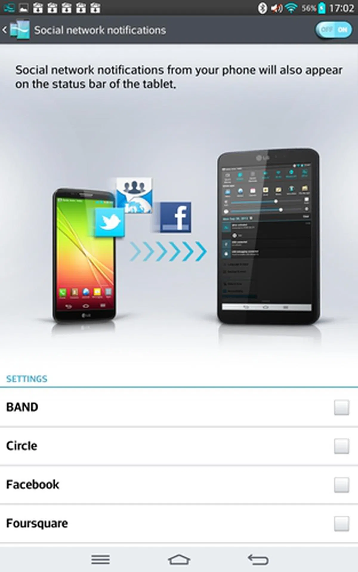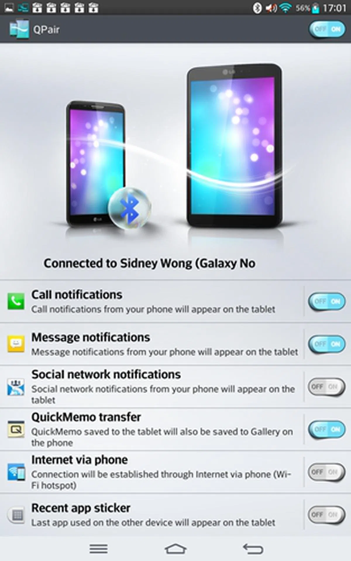 In addition to message and call management with QPair, notes created on LG's QuickMemo are saved in the Gallery on the LG smartphone and tablet. You also have one-click tethering connection between the two devices so that you no longer need to spare extra time to turn on the Wi-Fi hotspot through layers of menu settings.