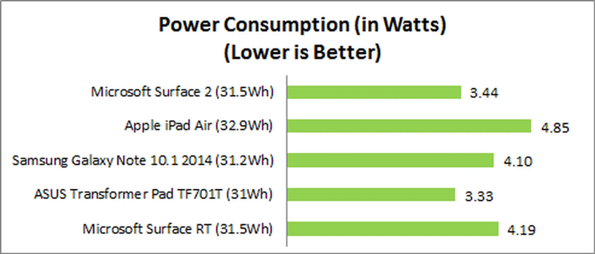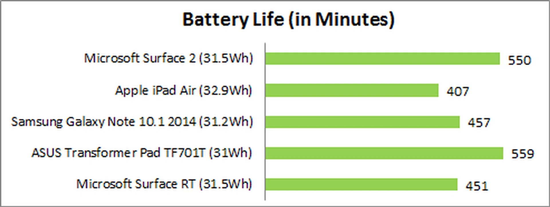 The Surface 2 utilizes the same 31.5Wh battery as the Surface RT. Impressively, despite its higher resolution display and more powerful speakers, the Surface 2 was able to last nine hours and ten minutes, a full 99 minutes longer than the Surface RT. The Surface 2's long battery life can probably be attributed to its very power efficient Tegra 4 processor. In fact, compared to the rest of our fielded comparisons, the Surface 2 was one of the best, losing only by nine minutes to the other Tegra 4-powered device, ASUS' Transformer Pad TF701T.