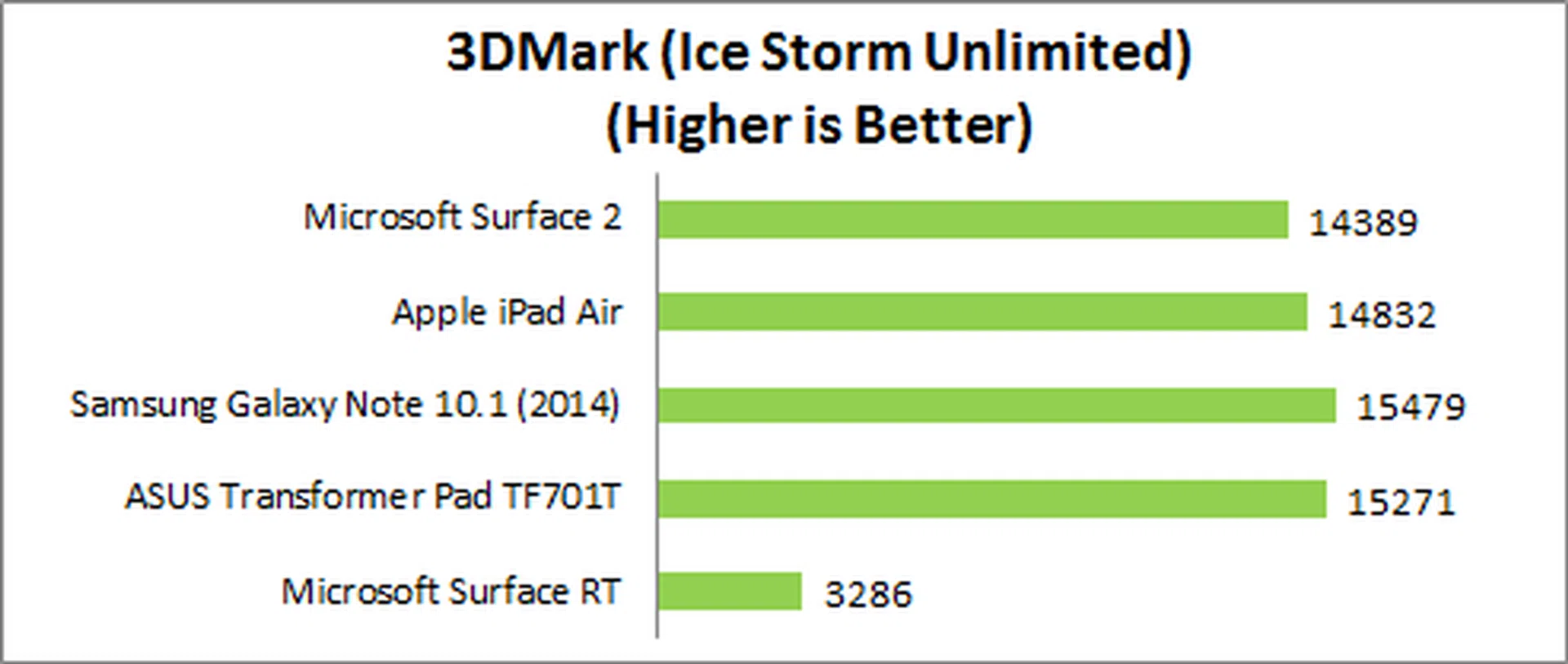 The Surface 2 has been upgraded to NVIDIA's quad-core Tegra 4 processor, which is powered by four Cortex-A15 CPU cores. Graphics performance is vastly improved with a 72-core GPU, which is six times faster than the Tegra 3 processor found in the Surface RT. For our performance benchmarks we will be pitting the Surface 2 up against its main tablet competitors, Apple's iPad Air and Samsung's Galaxy Note 10.1 (2014), as well as the Tegra 4-powered ASUS Transformer Pad TF701T. We'll also take a look at how it compares to its predecessor, the Surface RT.