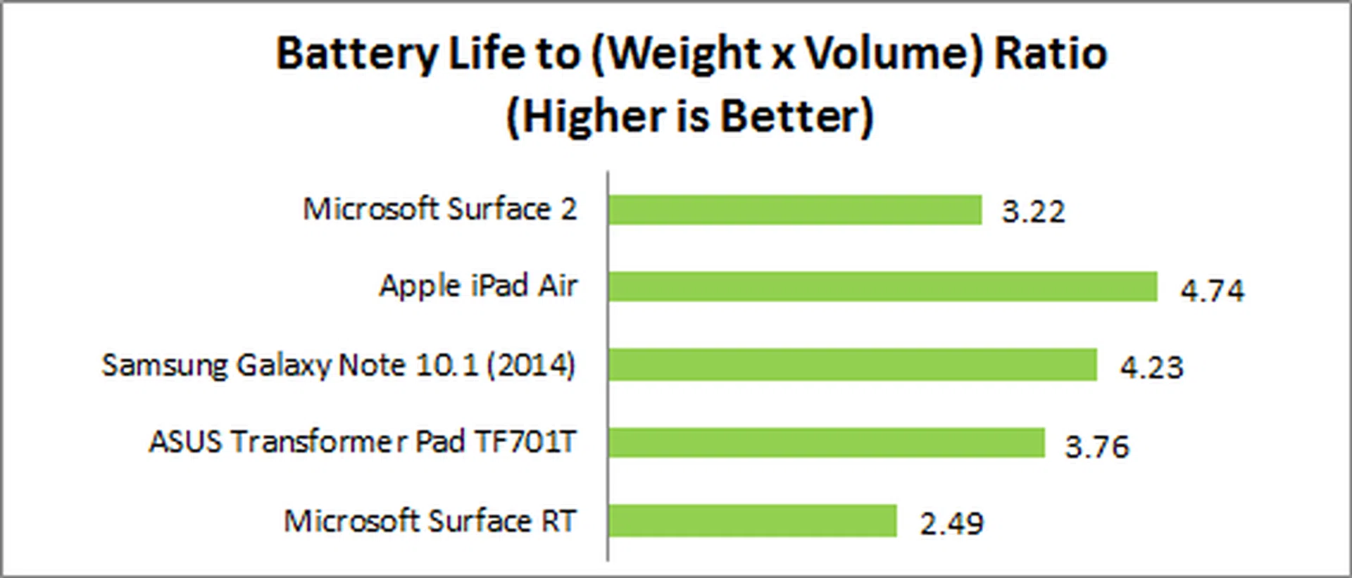 Our Portability score factors in battery life, weight and volume to give you an idea of how easy it is to carry each device around. Unfortunately, even with its fantastic battery life, the Surface 2 didn't fare as well as the other tablets here due to its fairly heavy weight.