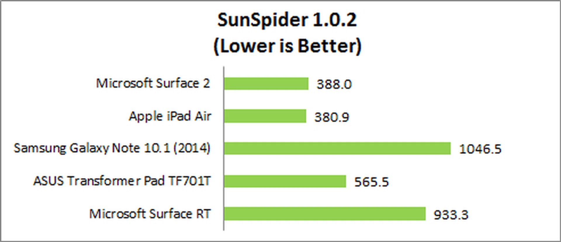 The Surface 2 performed very well in this test, matching Apple's iPad Air. Microsoft has put a lot of work into optimizing IE for Windows RT and it shows, delivering a fast and snappy experience. On the other, this test could be a victim of 'targeted optimization'. Given the discrepancy in performance between a similarly powered ASUS Transformer Pad TF701T and the Surface 2 running the same hardware, it might be a valid question. However, the difference in OS and browser used also affects results; as such, it's difficult to pin the outcome as 'targeted optimization'.