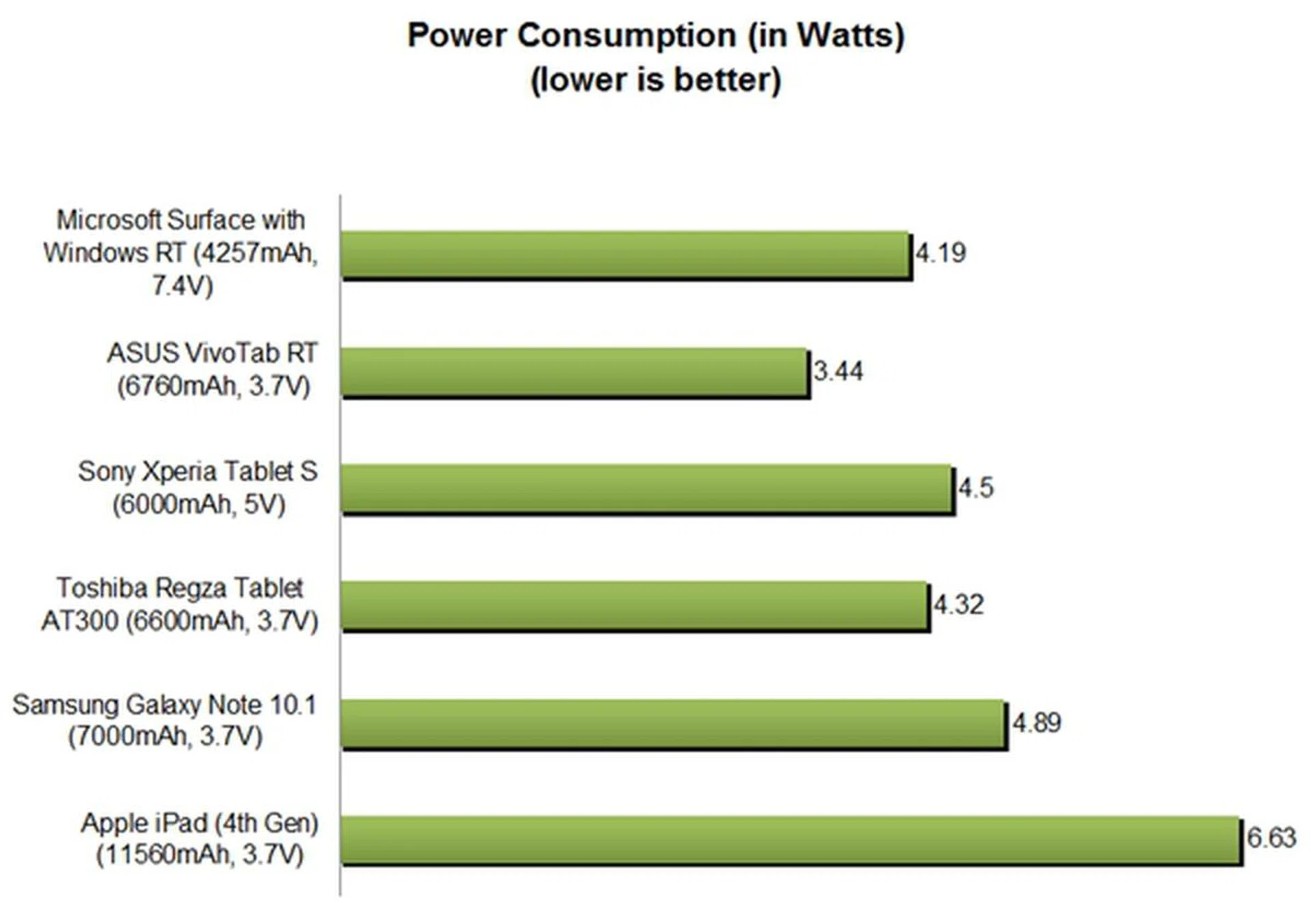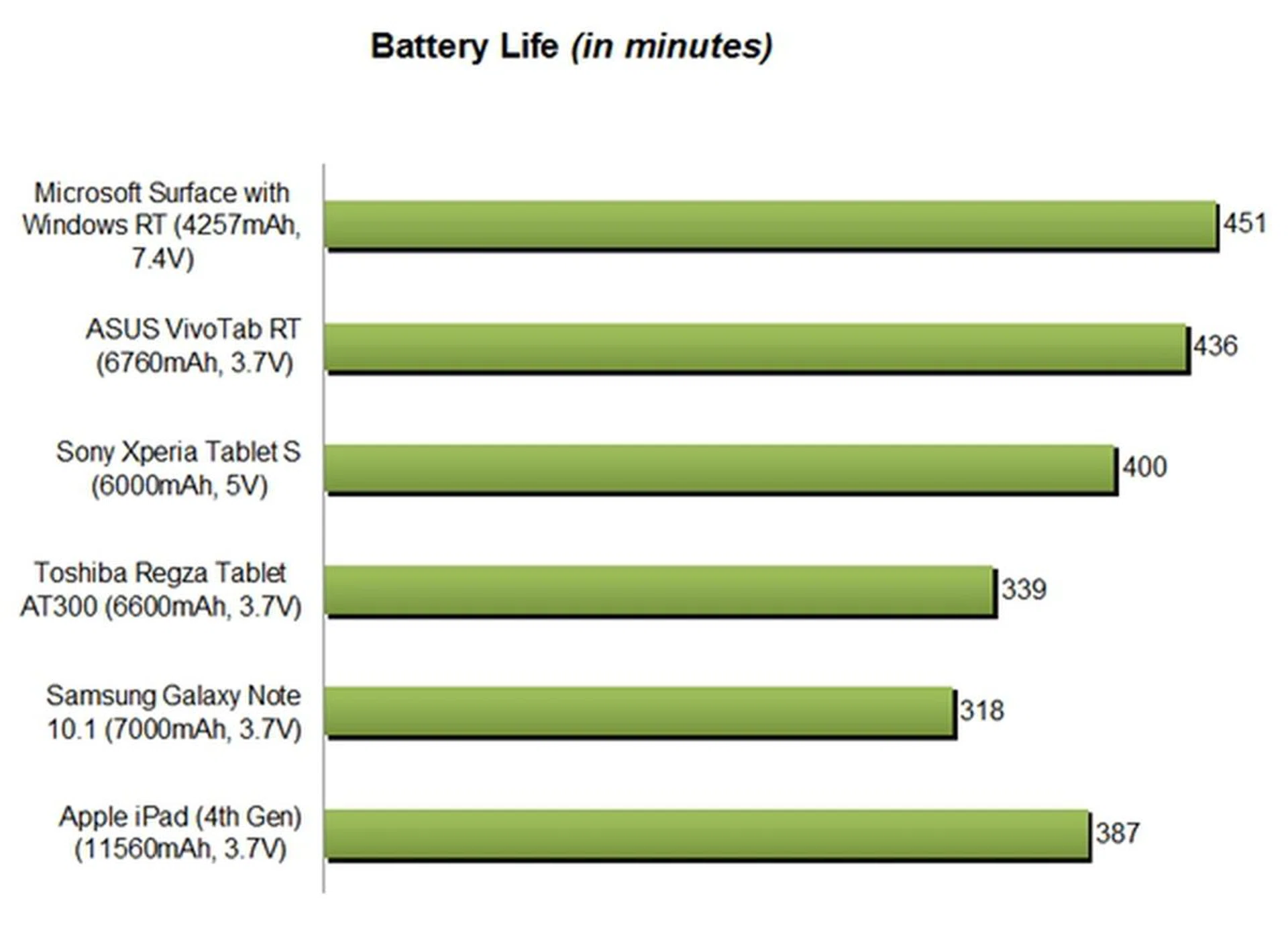 Even though the Surface has the biggest display and the smallest battery capacity among the tablets compared, it managed to outlast the competition with an uptime of 7 hours and 31 minutes. The ASUS VivoTab RT is trailing behind by a slight margin of 15 minutes.