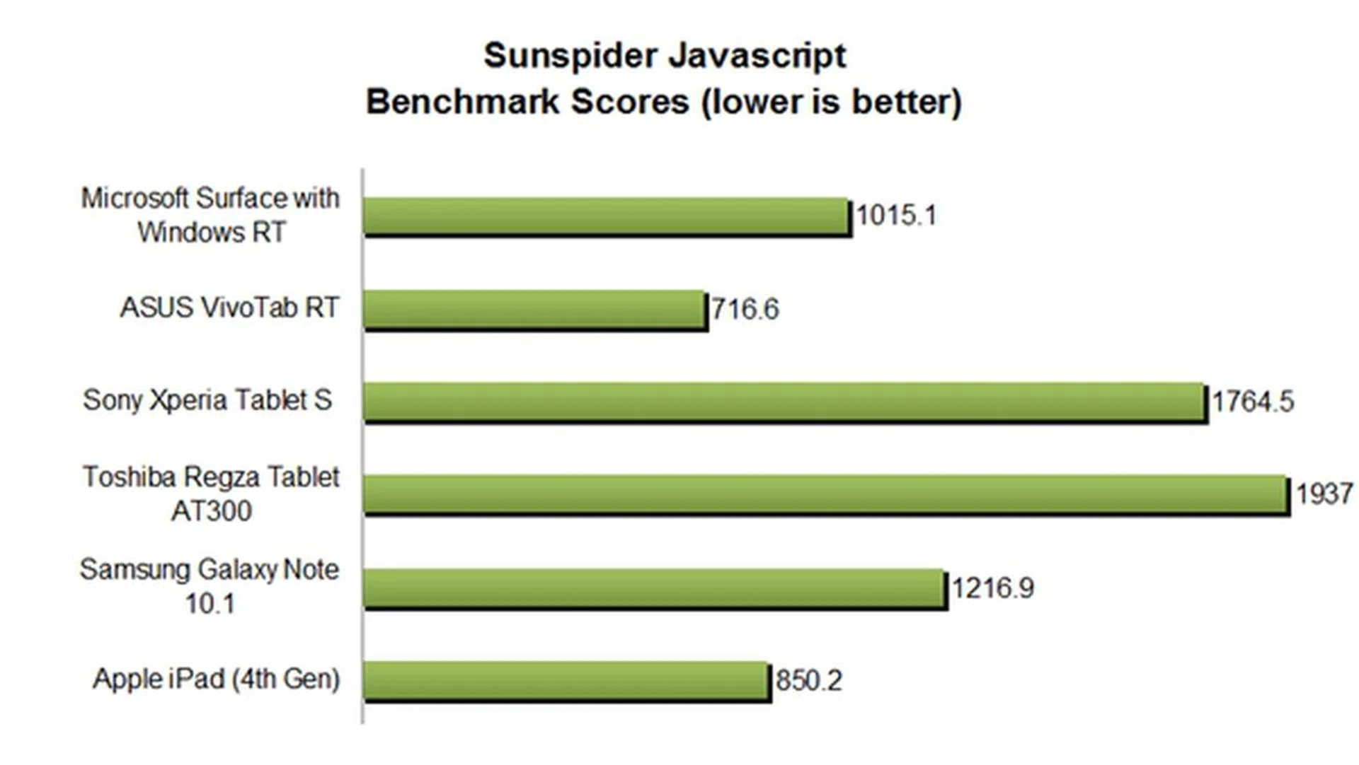 As such, we will be comparing the Surface with the Sony Xperia Tablet S, Samsung Galaxy Note 10.1 and Apple iPad (4th Gen). We also throw in the ASUS VivoTab RT to have a better gauge of how two Windows RT tablets fare against each other. We used the SunSpider Javascript benchmark to measure the browsing performance of the different tablets across the various software platforms.