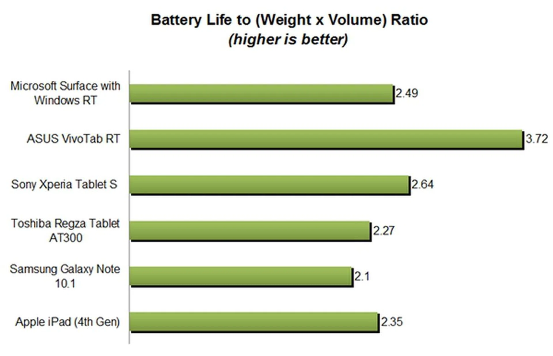 While most Android vendors are still struggling to strike the fine balance of performance and power management, Microsoft got it right the first time with the Surface. In the Portability Index where each device is assessed on its ability to balance battery mileage. with its size and portability, the Surface ranked third behind the ASUS VivoTab RT and Sony Xperia Tablet S as the Microsoft slate is the heaviest among the tablets. Its heft was of course touched upon earlier, attributing to its Gorilla Glass 2 display and a sturdy overall build.