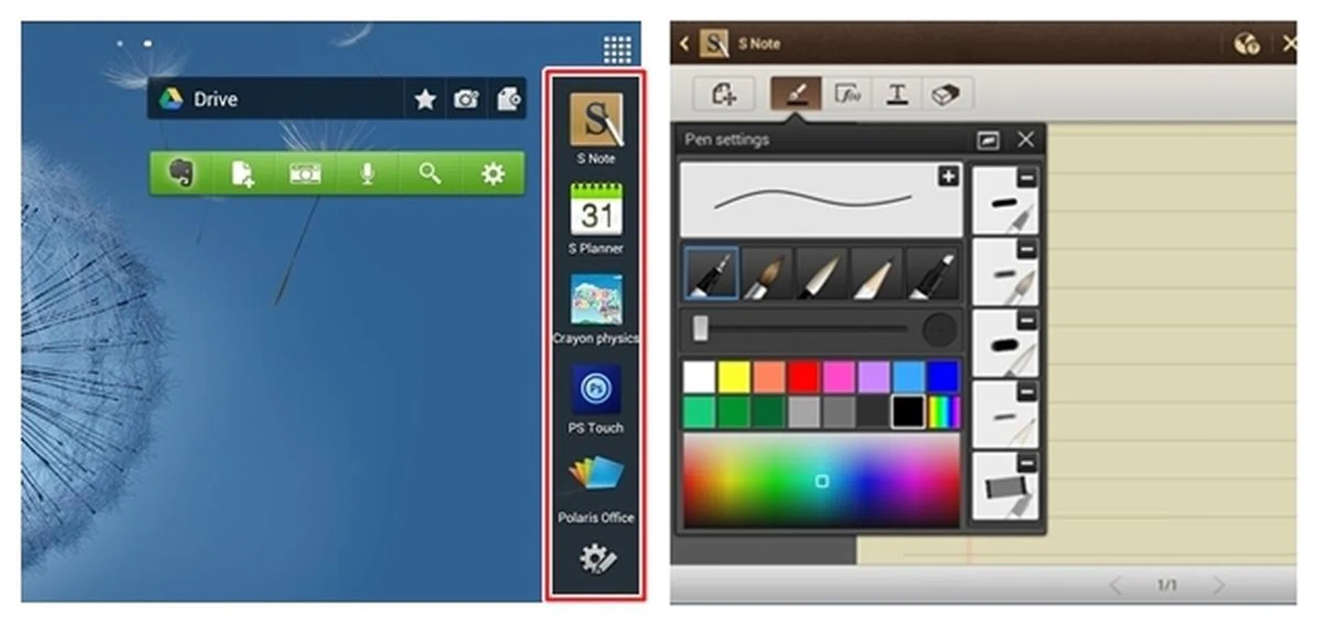 - Taking the S Pen out of its slot will prompt the tablet to display the shortcuts toolbar on the right of the screen. The menu will display 6 apps (S Note, S Planner, Crayon Physics, PS Touch, Polaris Office and Pen Settings). This is the default setting, but you can customize it to open one of the six apps.