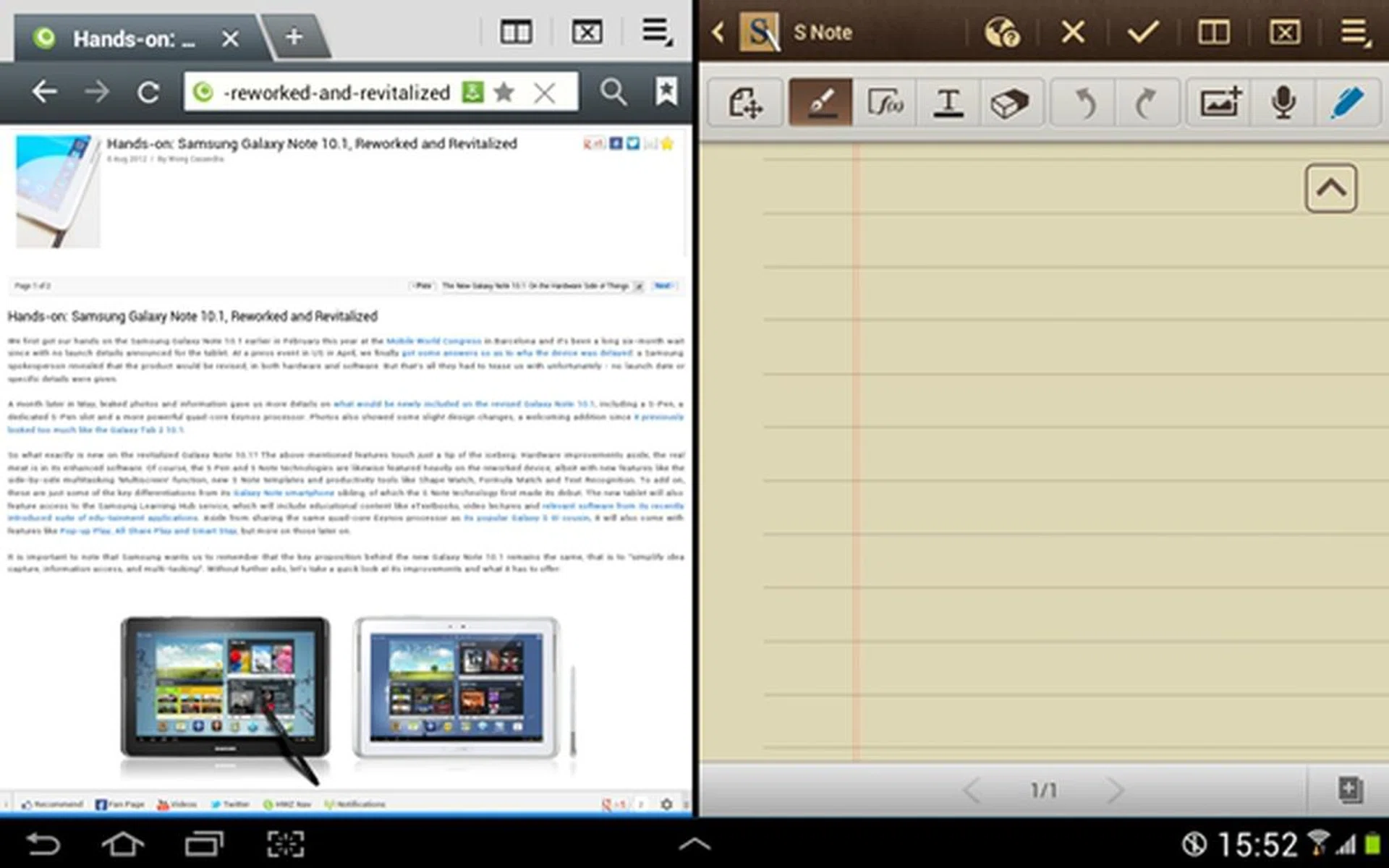Multitasking reaches a new level on the Galaxy Note 10.1 with the Multi Screen feature. It allows you to access two apps simultaneously on the same screen. As seen above, you can browse the Internet and take down notes at the same time with S Note.