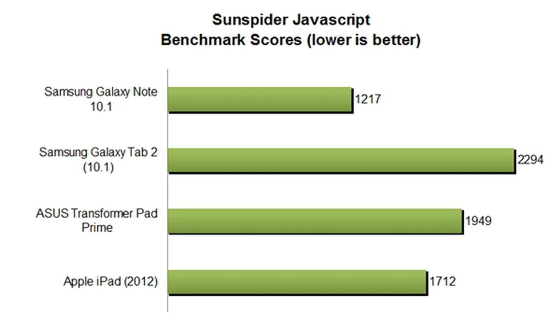 However, the Galaxy Note 10.1 took the lead again in the SunSpider Javascript with an amazing low score of 1217. It even edged out the Android 4.1-powered Google Nexus 7, which registered a score of 1697.