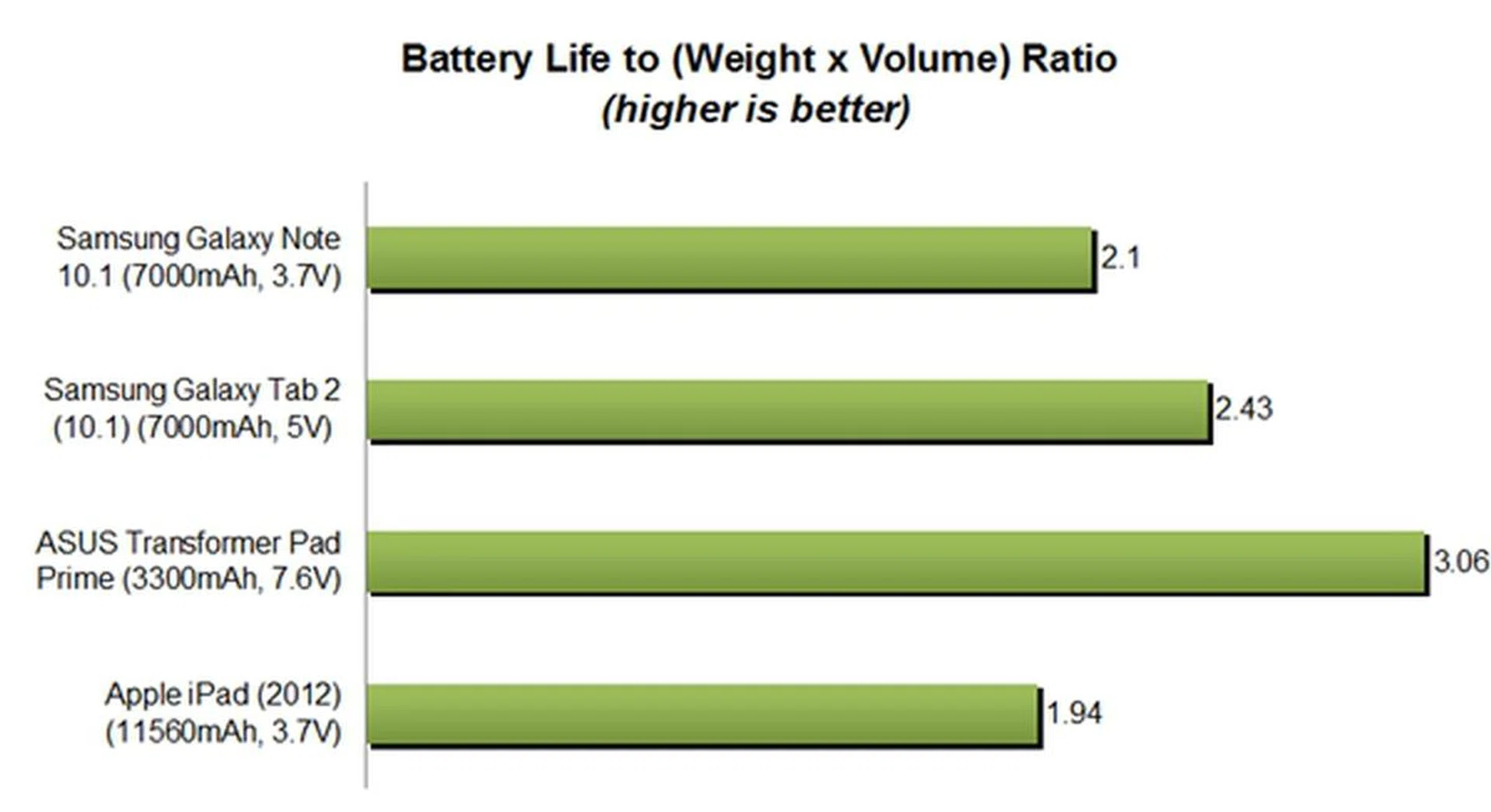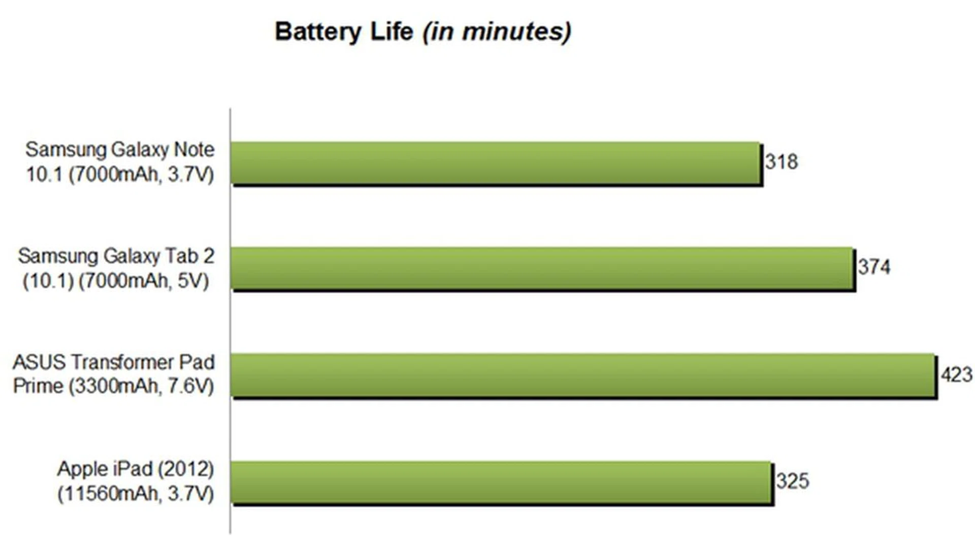 When compared to its 10.1-inch dual-core Galaxy Tab 2 (10.1), the Galaxy Note 10.1 doesn't fare any better due to its lower battery's Wh rating. Generally, a higher Wh rating will mean a longer runtime per charge. Due to its overall weight, volume and battery mileage, the Galaxy Note 10.1 narrowly missed being the last.
