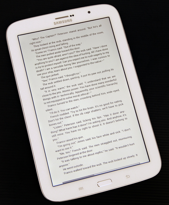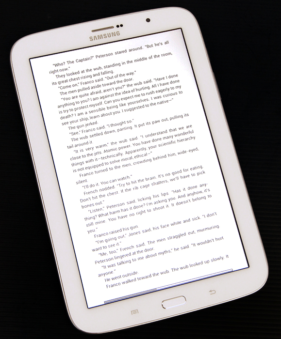 However, to address the concerns of the display appearing too pixelated, the Tab 3 8.0 comes with a "Reading Mode", in which it will adjust the white balance of the display, and render the text to have stronger anti-aliasing, i.e. softer edges. While it is a far cry from "Retina" or full HD resolution tablets, at least this mode makes reading e-books acceptable without much eye strain. As we’ve described, it doesn’t eliminate the presence of pixel visibility, but it tries its best to appear more pleasant for reading extended periods.