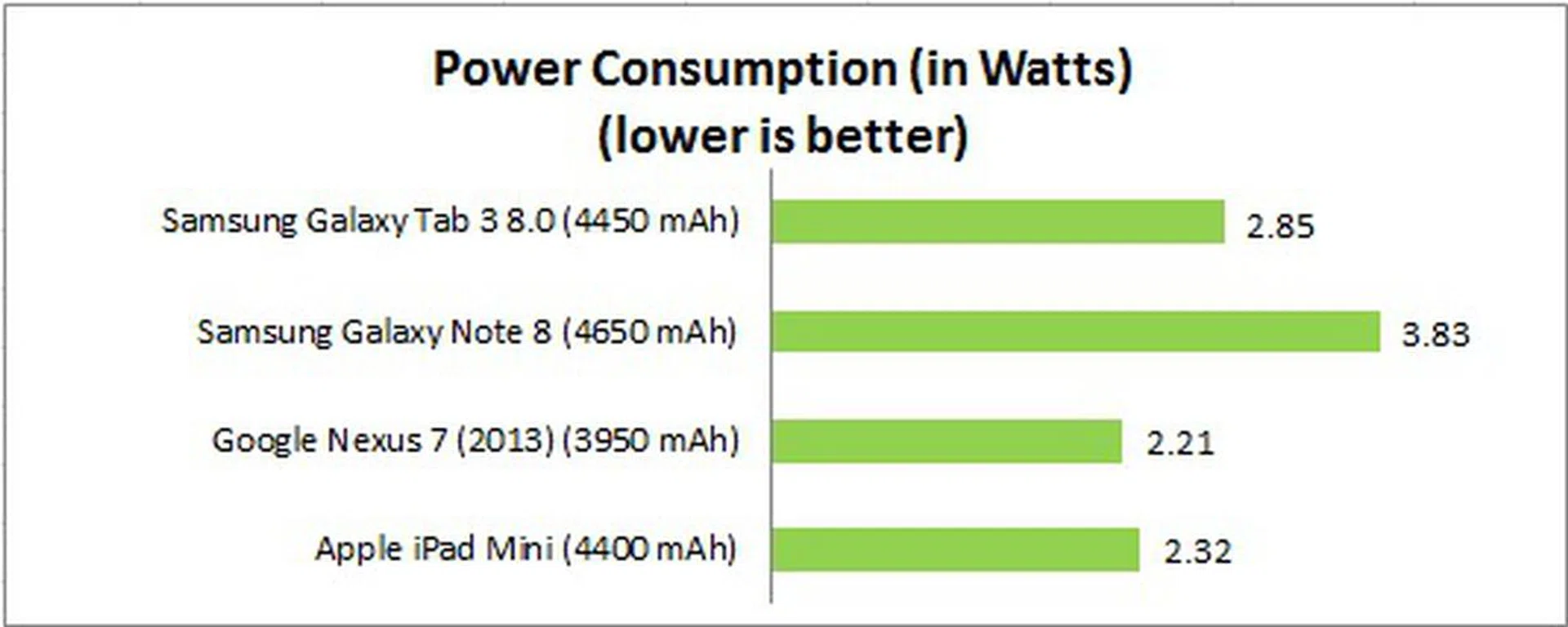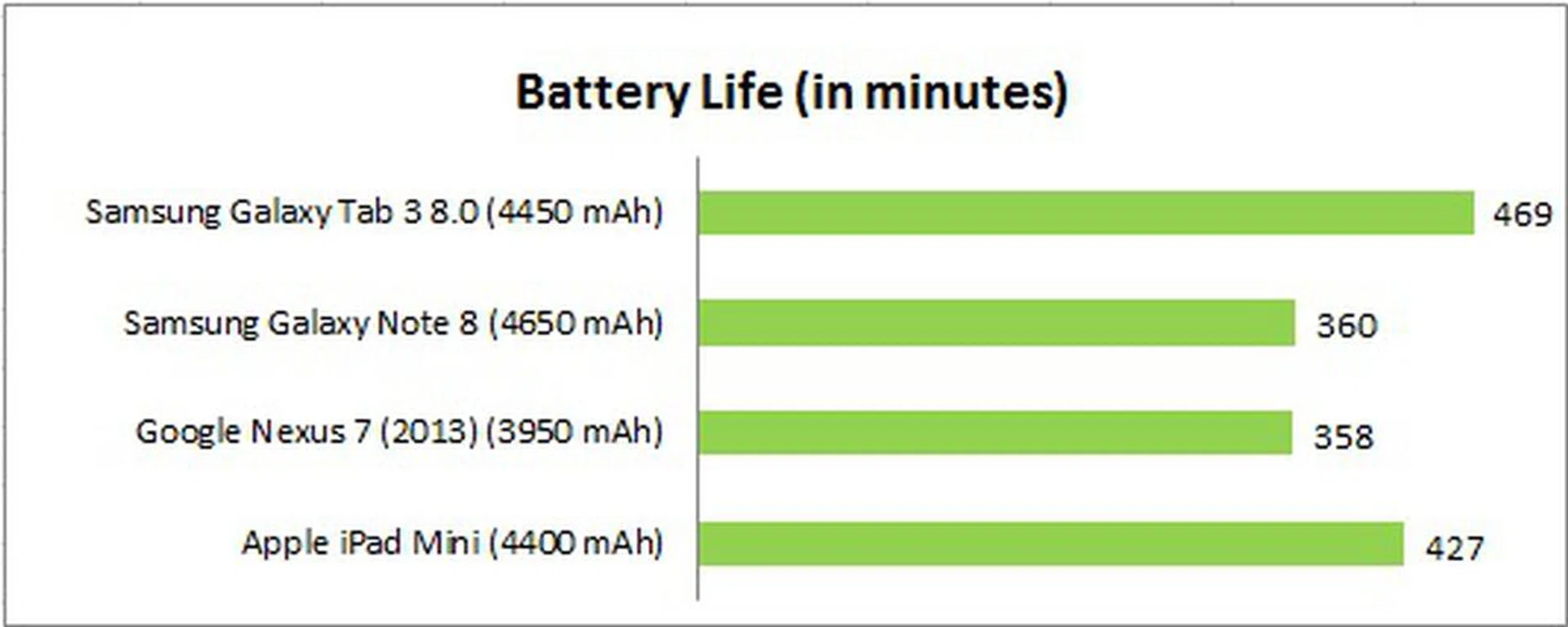 The Galaxy Tab 3 8.0 lasted rather well, making it past 7 hours and 49 minutes before shutting down. For some reason, despite the unit’s relatively low resolution (1280 x 800 pixels) compared to Google Nexus 7 (2013) and dual-core processor, its overall power consumption wasn’t the lowest. Despite that, the overall battery charge it can sustain is more than the competition and this easily allowed it outlast the comparison.