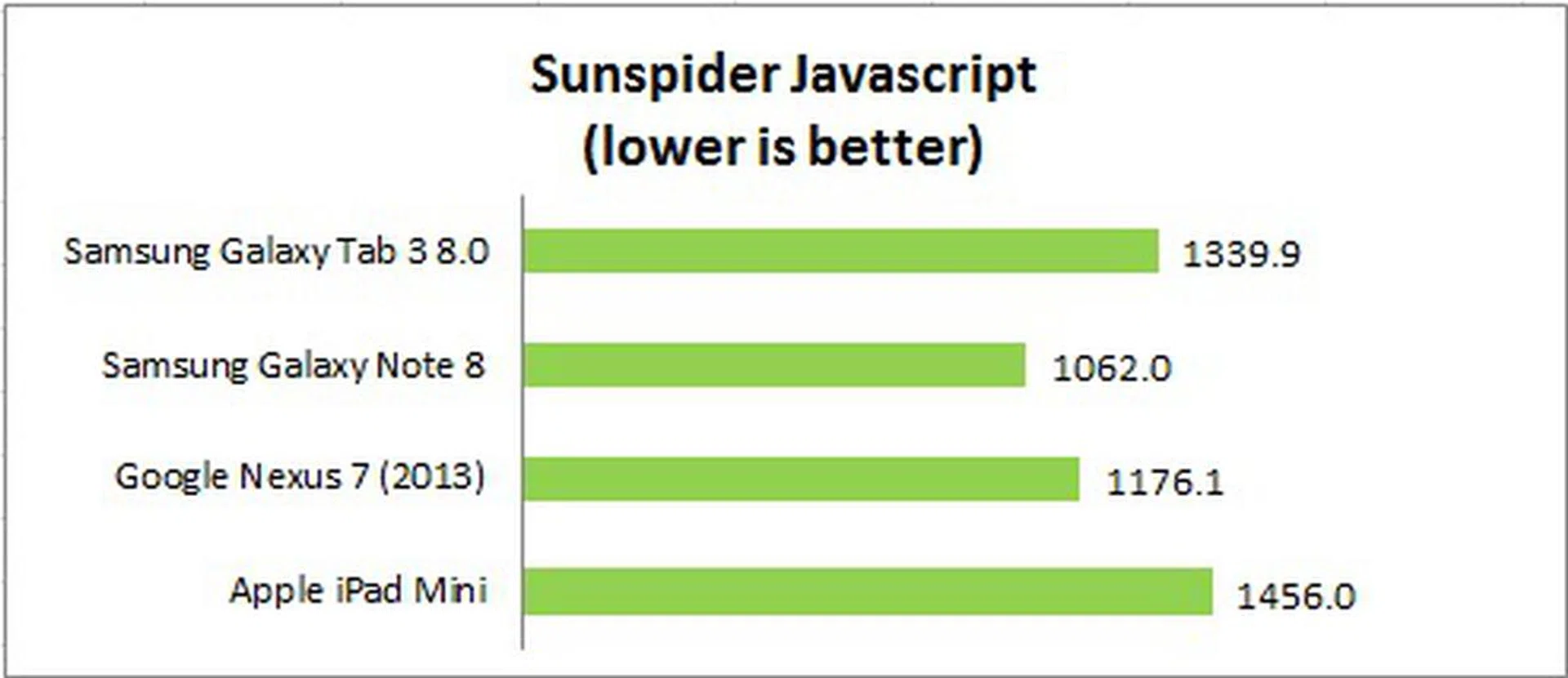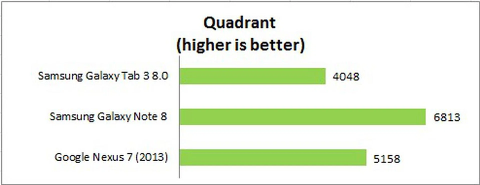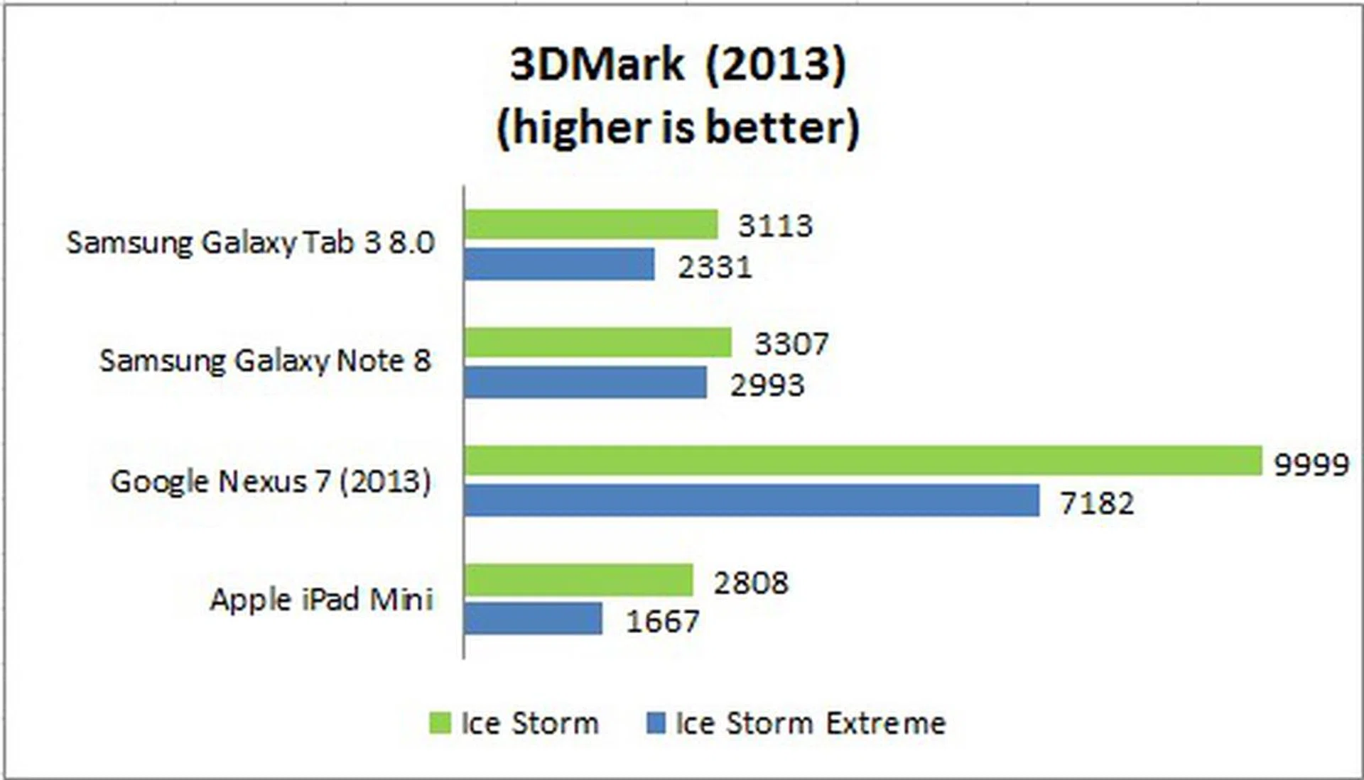 To measure the device’s capability of processing 3D graphics and a mark of tackling complex mobile games, the cross-platform compliant 3DMark 2013 was used. As expected, Galaxy Tab 3 8.0 performed average. It is worthwhile to note that despite its cousin, the Galaxy Note 8, being a quad-core part, the 3D performance of the latter is roughly the same as the former.