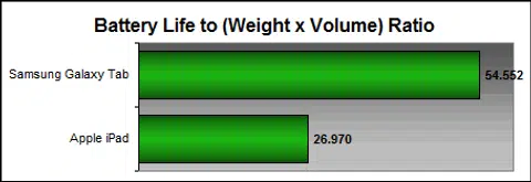 Finally for our Portability Index test, a simple benchmark test based on a formula where we obtain a ratio derived from a device's battery uptime divided by the product of its weight and volume. If it sounds complicated, don't worry about it, as the final numbers are pretty easy to look at. The bigger the number, the more portable the device is. And looking the graph below, the Galaxy Tab is almost two time more portable than the Apple device despite the fact the battery uptime figures swing the other way around. This is a direct result in the size/weight differences which ranks the Galaxy Tab as a more handy device and it certainly is from actual usage.