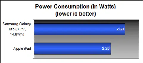 Lasting for 5 hours 41 minutes, the Samsung Galaxy Tab seems prepared for a near full day of use, despite running a more grueling 720p clip. We do have to mention though, while the power consumption scores are near, bear in mind that the screen size is also smaller at half the size of the iPad. The iPad on the other hand sports two batteries compared to the single one on the Galaxy Tab. Other factors to consider are the power efficiency optimization at the firmware level and the different OS used by both devices. With these aspects in mind, it seems like the power consumption figure is a bit on the high side for the Galaxy Tab, thus resulting in quite a big difference in battery uptime.