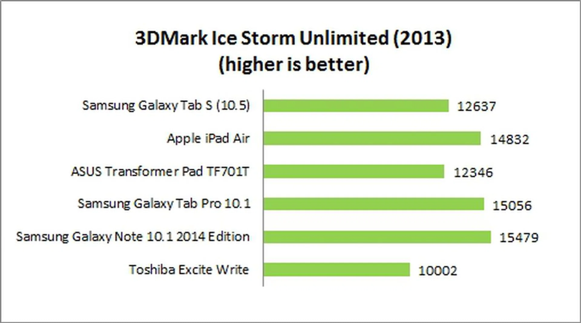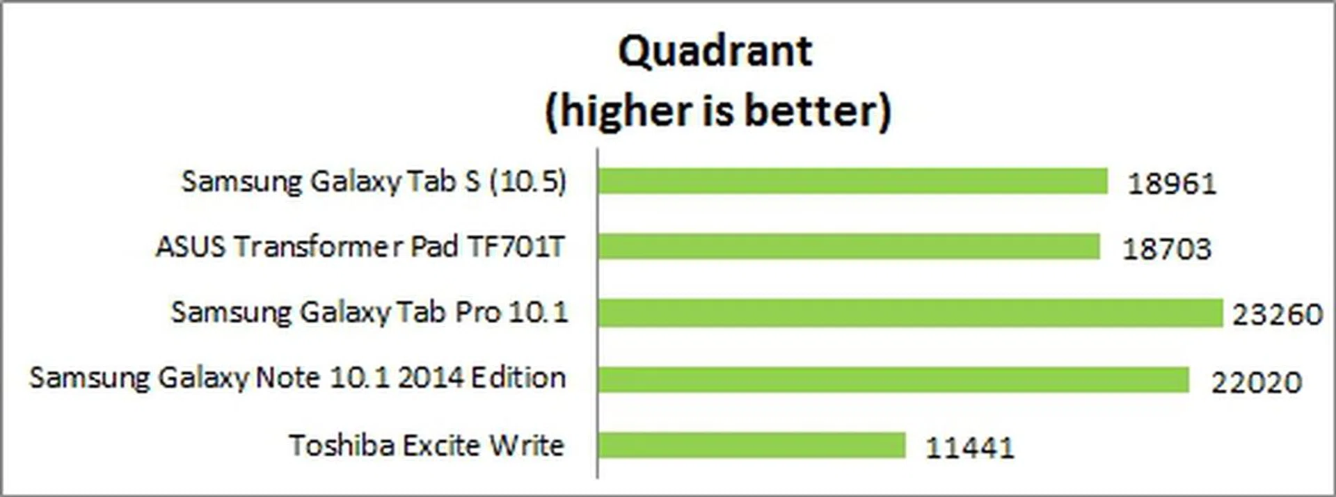 The Exynos chipset in the Tab S (10.5) is on-par with the Tegra 4-powered Transformer Pad TF701T, but fell short of matching the benchmark performance of its Qualcomm Snapdragon counterparts in the other two Samsung tablets. For example, the Note 10.1 2014 Edition fared 16% better than the Tab S (10.5).