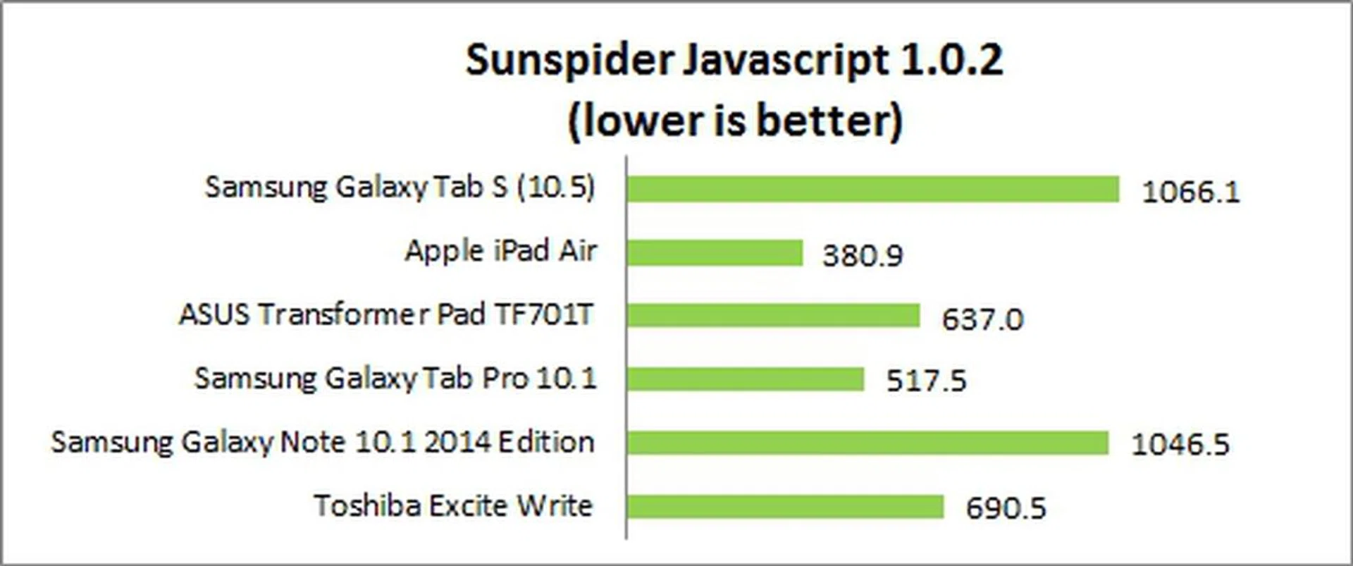 The Tab S (10.5) emerged last in the SunSpider Javascript benchmark where most of its competitors were ahead of it by significant margins.