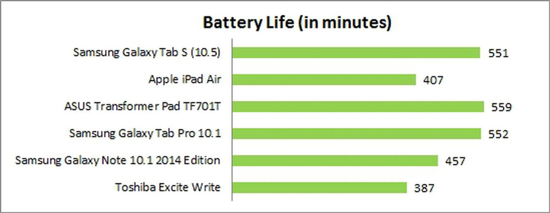The Tab S (10.5) lasted 9 hours and 11 minutes, which placed it among the top 10-inch tablets for battery up-time. The Transformer Pad TF701T and Tab Pro 10.1 are in the same ballpark. Compared to the iPad Air, the Tab S (10.5) managed to last 35% longer.