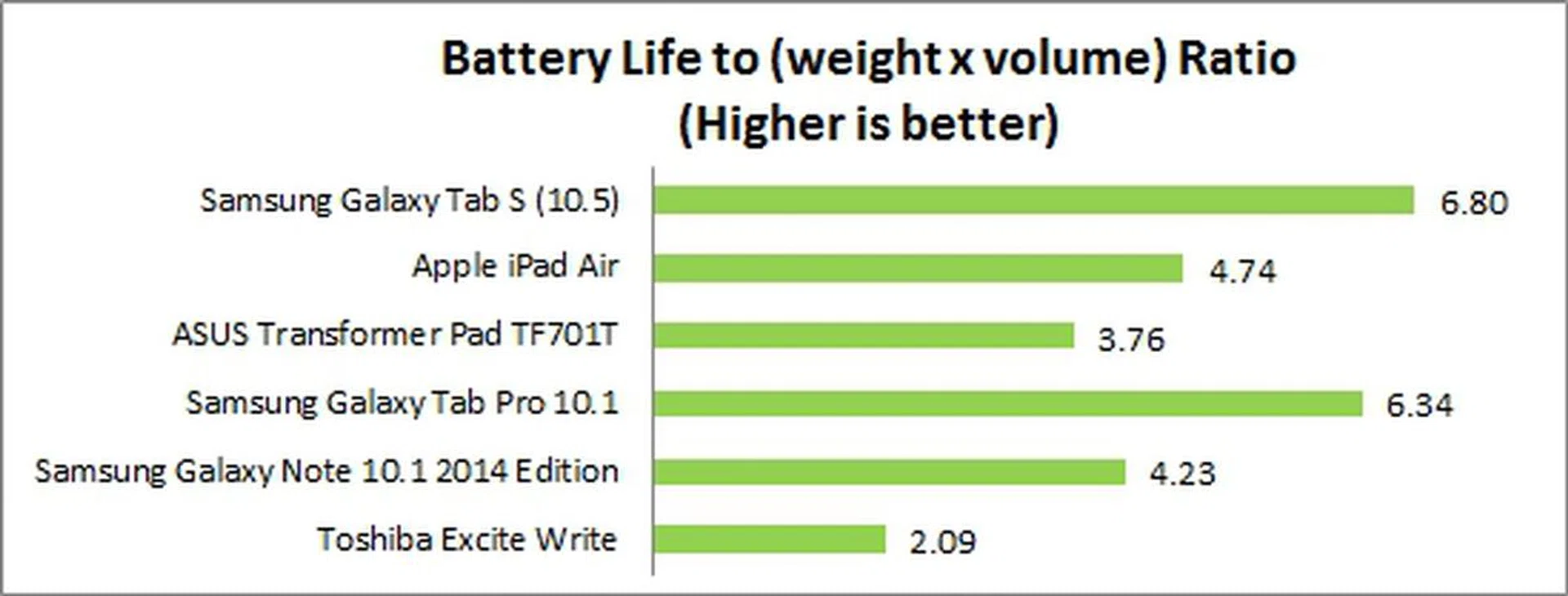 In our Portability Index where where each device is assessed on its ability to balance battery mileage against its size and mass, the Tab S (10.5) clinched the top spot easily as it is the thinnest and lightest 10-inch tablet in this comparison.