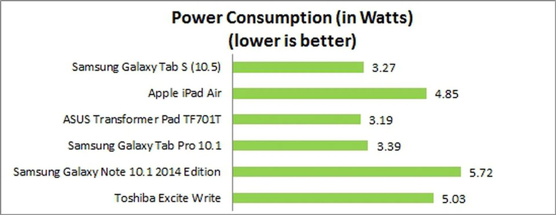 This is evident in the Power Consumption chart where the ASUS slate registered the lowest power consumption among the tablets compared, despite using an LCD screen. The Tab S (10.5) isn't very far off either, thanks to its power-efficient Super AMOLED display.