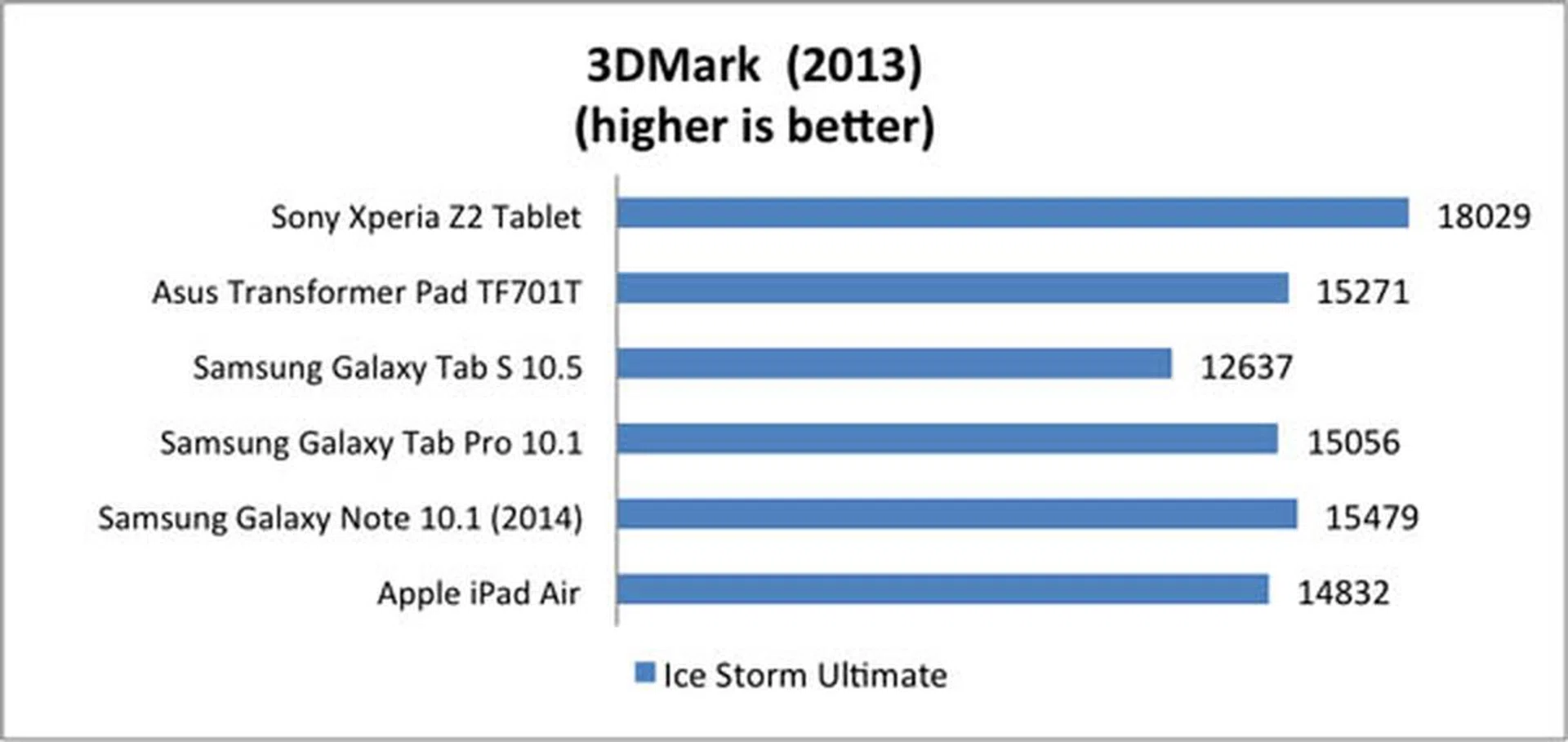 The Z2 Tablet performed much better here, scoring higher than any of the other tablets, and taking a huge lead over the iPad Air's A7 chip by about 4,000 points, and over the Tab S’s Exynos 5 Octa and TF701T’s Tegra 4 by about 6,000 points.