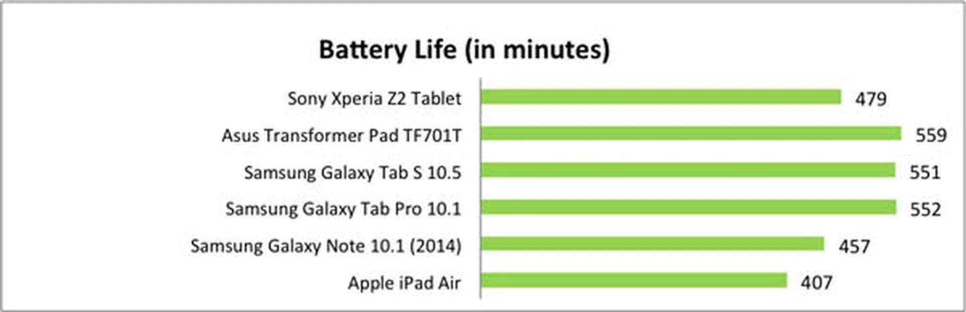 The Z2 Tablet has the same 6,000mAh capacity battery as its predecessor. In our benchmark test, it lasted for 7 hours 59 min, which is about an hour shorter than the Tab S, despite its lower resolution. This is likely due its smaller battery capacity, as the Tab S has a 7,900mAh battery.