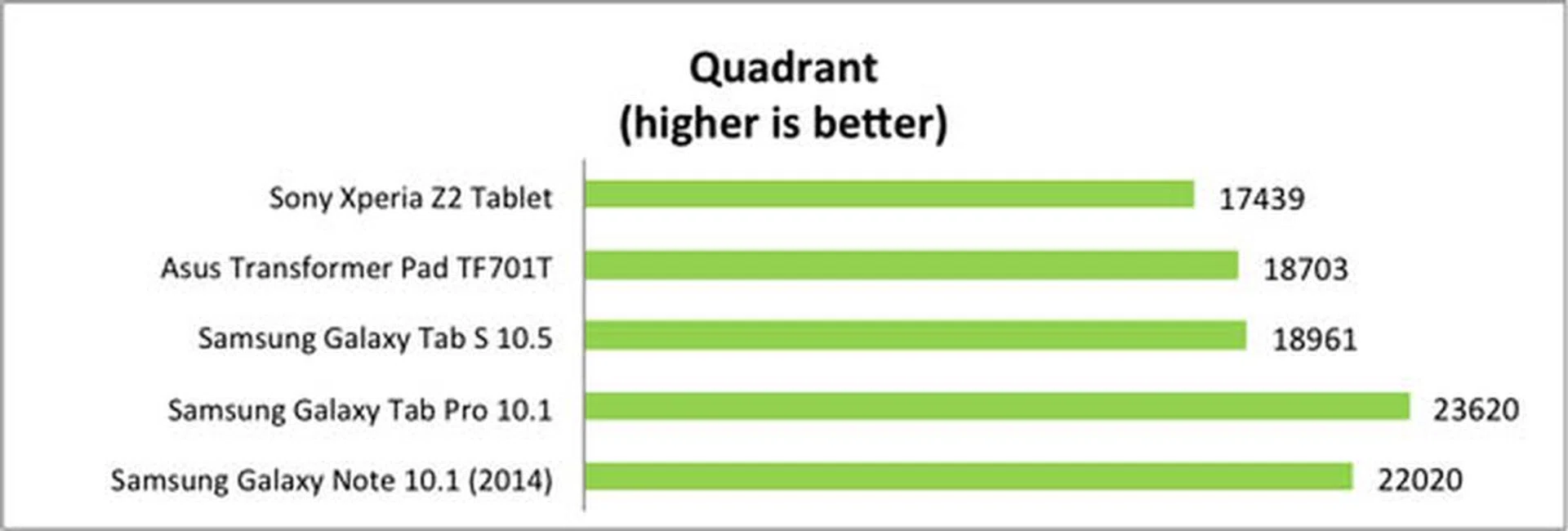 Quadrant evaluates an Android device's CPU, memory, I/O and 3D graphics performances. In this benchmark, the Z2 Tablet’s Snapdragon 801 surprisingly fell slightly short of the Tab S’s Exynos 5 Octa chip, as well as the Tegra 4 chip in TF701T.