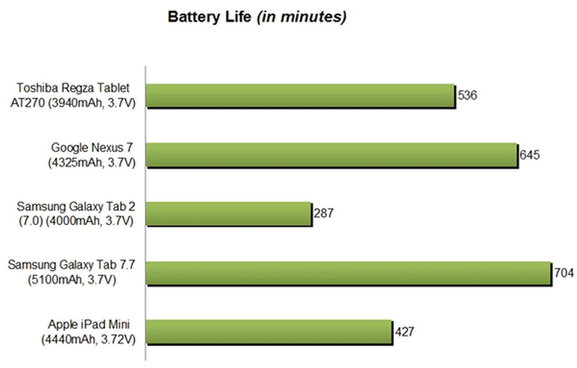 Device | Toshiba Regza Tablet AT270 (3G) | Google Nexus 7 | Samsung Galaxy Tab 2 (7.0) | Samsung Galaxy Tab 7.7 | Apple iPad Mini |