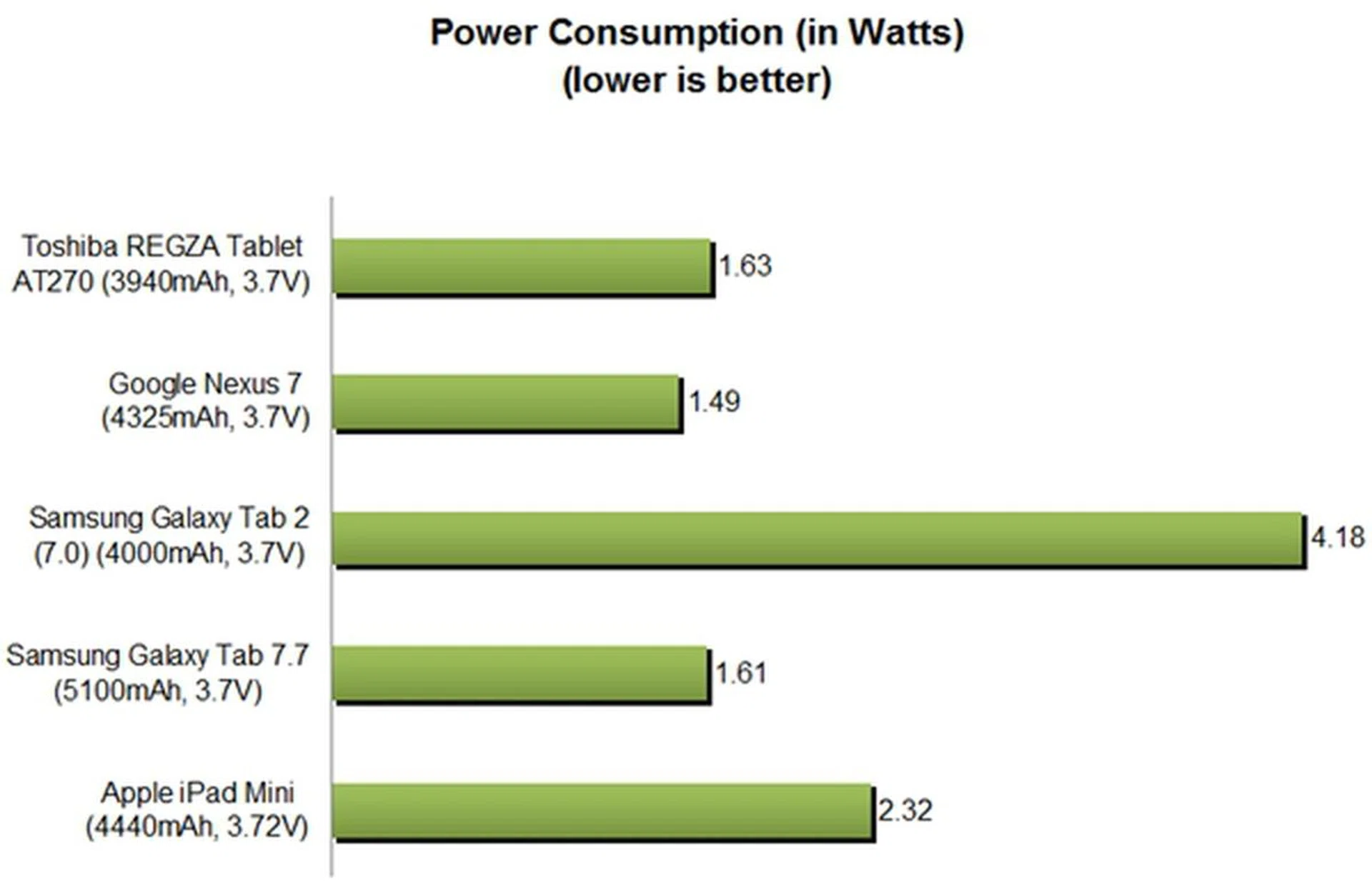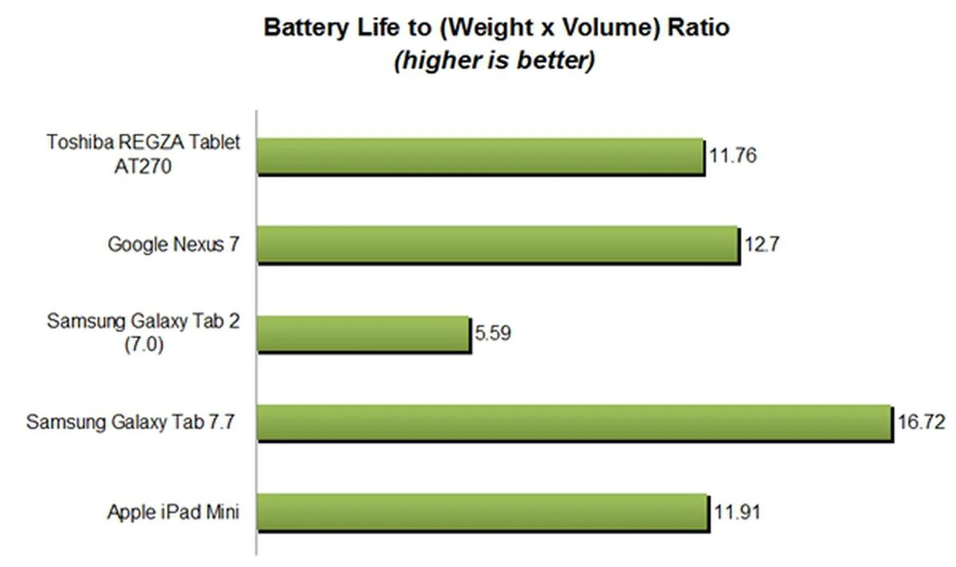 Power consumption wise, it is one of the lowest among the tablets compared, and since both the AT270 and Galaxy Tab 7.7 boast AMOLED displays, the power draw was identical. Taking into account its overall weight, volume and battery mileage, the AT270 didn't fare as well in our Portability Index as it is the heaviest among the comparison tablets. Apple's iPad Mini capitalized on its ultra-thin (7.2mm) build and featherweight (308g) design to narrowly pull ahead in the Portability Index. The Samsung Galaxy Tab 7.7 with its extra long battery life, comes up tops again in this comparison as well.