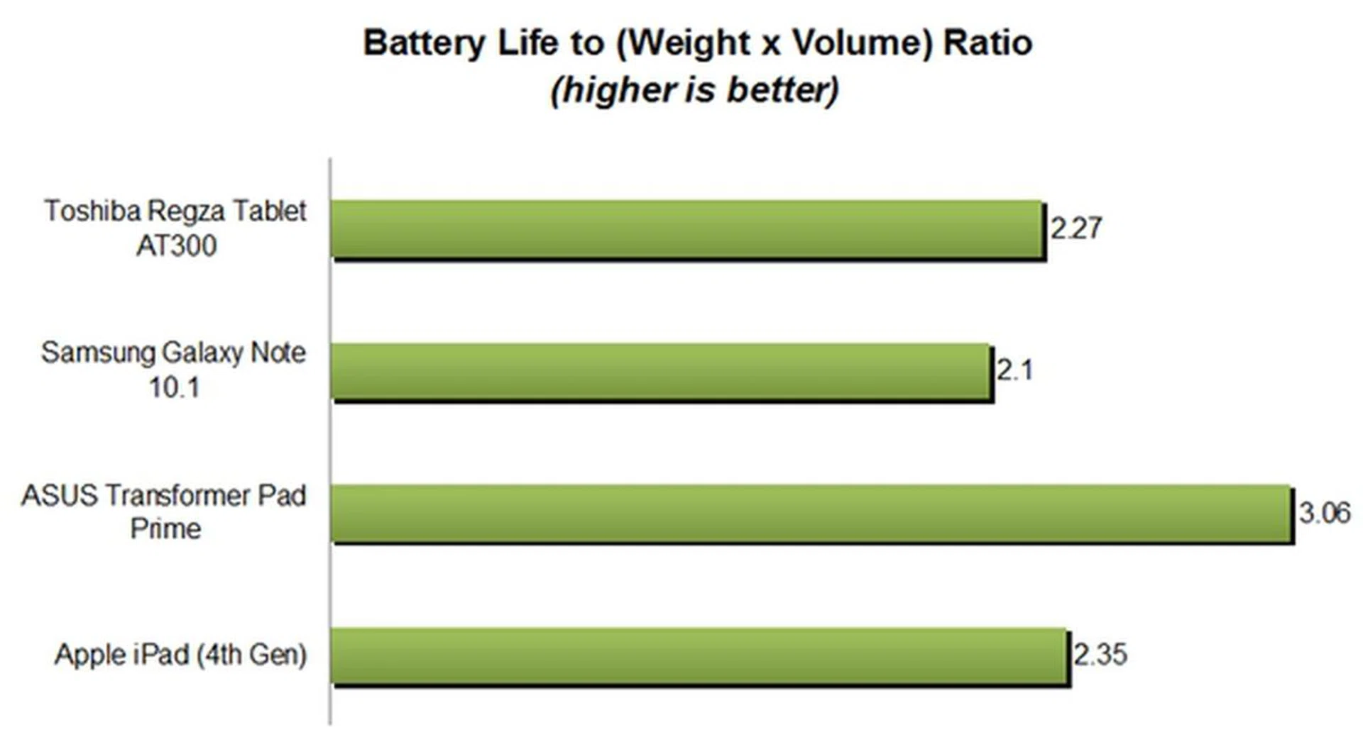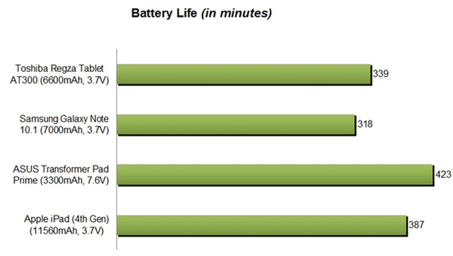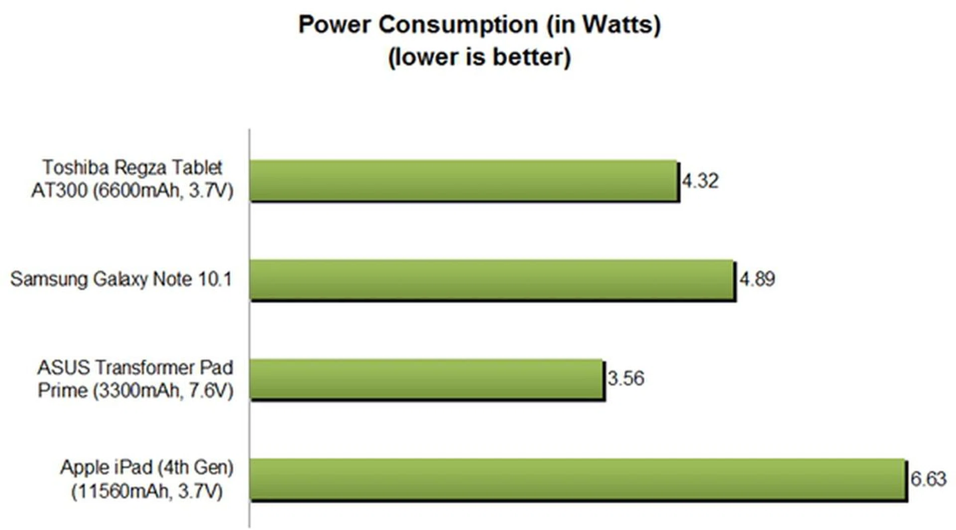 However, the ASUS Transformer Pad Prime could last more than 7 hours with half the battery capacity (3,300mAh). We attributed the Toshiba slate's poorer battery mileage to its higher power consumption of 4.32W. Taking into account its overall weight, volume and battery mileage, the AT300 avoided being ranked the last due to its light form factor (585g and 9mm side profile). Of course, while it seems to be on a par with the latest Apple iPad, the truth is that the latter still has the upper hand with a Retina display that has nearly double the resolution of anything else in the market. This sips a lot of battery and the results show that in our power consumption chart. But, they've compensated it with enough battery capacity to still provide battery life that's comparable to the rest of the competition.