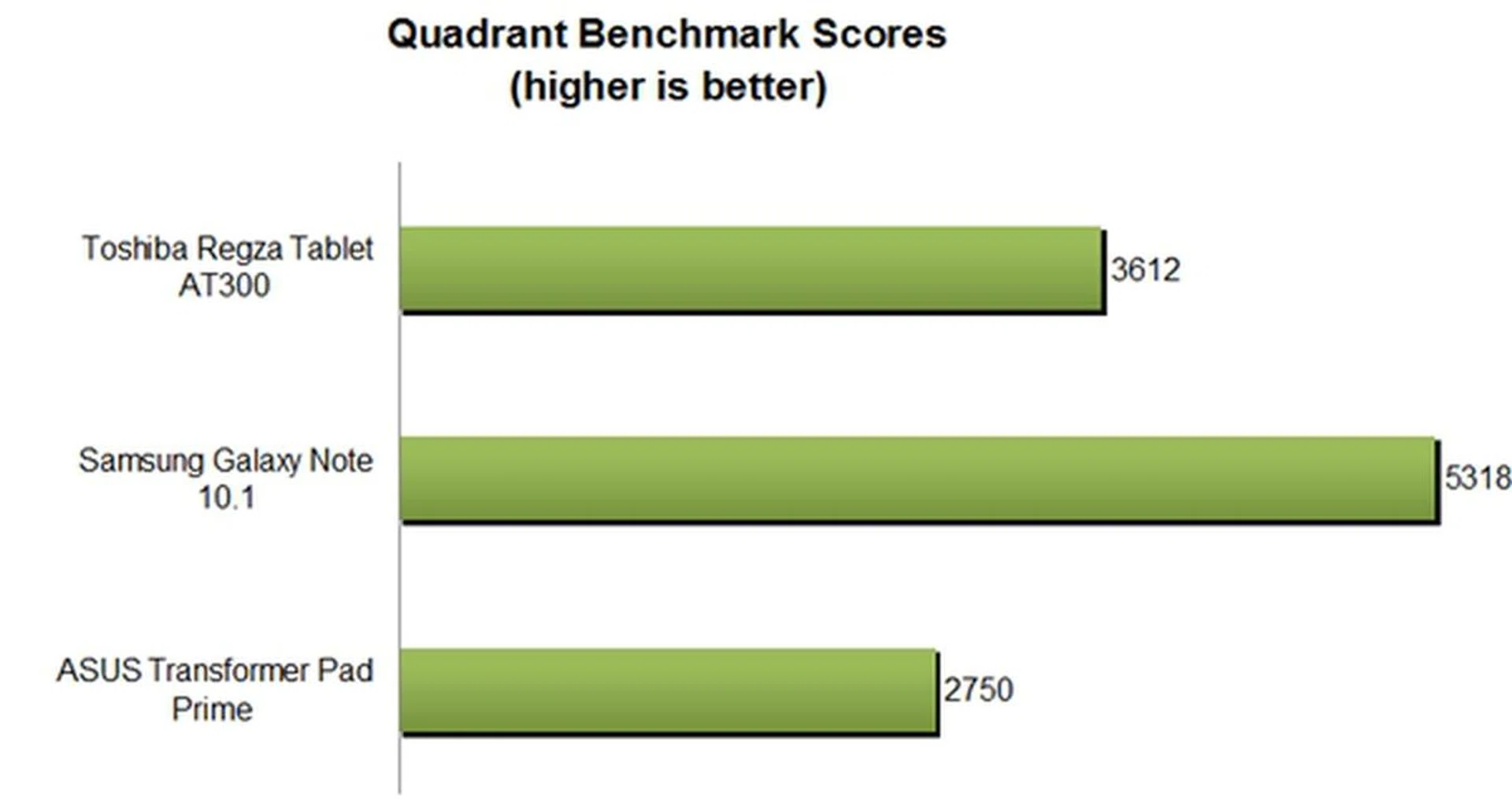 As such, we will be comparing the AT300 against the Samsung Galaxy Note 10.1, ASUS Transformer Pad Prime and the fourth generation Apple iPad to assess the performance of the Toshiba tablet. The following benchmarks are used for raw performance evaluation: -