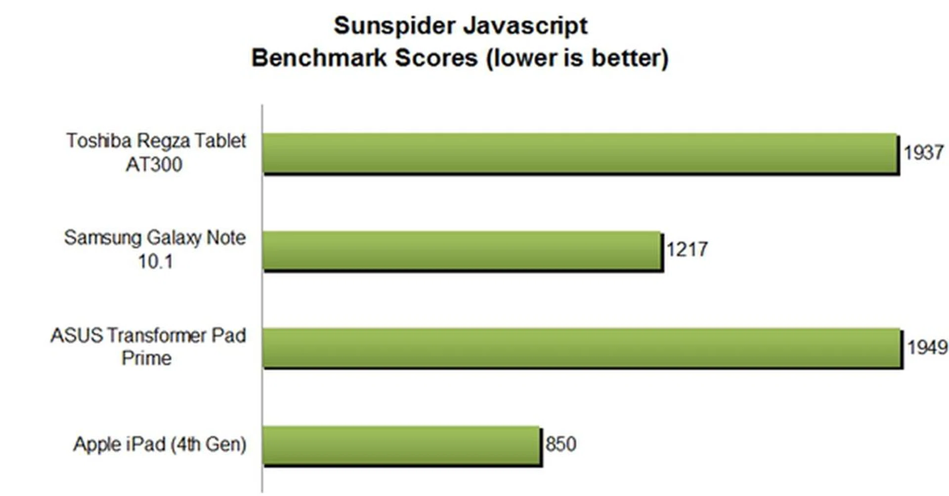 When it comes to the Sunspider benchmark, the Android tablets couldn't hold a candle to the fourth-gen Apple iPad where the Apple slate smashed the benchmarks with an astonishing score of 850ms (lower is better).