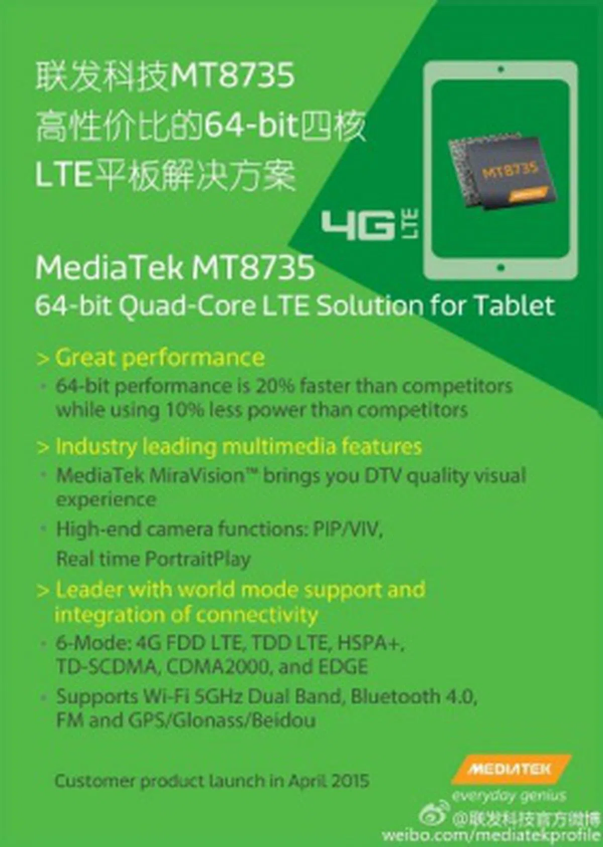 The more capable MT8735 is able to support 6-mode LTE networks (both FDD and TDD), HSPA+, TD-SCDMA, CDMA2000 and EDGE. MediaTek claims that this chipset is able to deliver 20% more performance with 10% less power consumption than competing chipsets. Both processors are stated to be used in entry to mid-range consumer tablet devices from this month in China and other Asian markets.