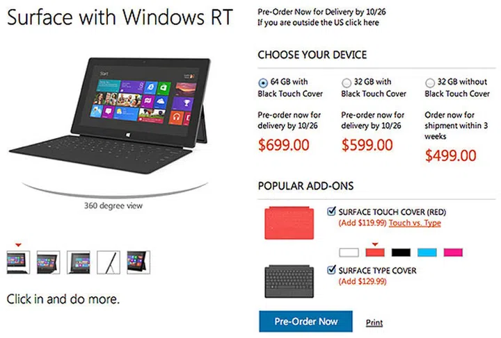 Online pre-order for Microsoft's ARM-based Surface RT tablets has started. The 32GB version is priced at US$499 without the Touch Cover; with the cover, it costs US$599. A 64GB version with the cover is available as well. Tech specs of the tablets are also revealed, so hit the link for more details.