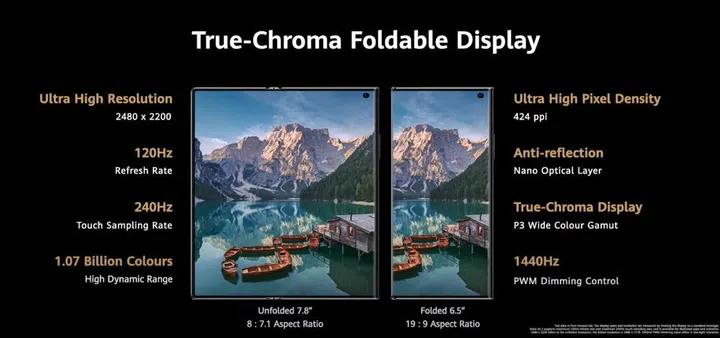 The Mate Xs 2 features a 120Hz, 2,480 x 2,200-pixel resolution Foldable True Chroma display. Unfolded, you get a 7.8-inch screen with an 8:7.1 aspect ratio, while the folded display will give you a 6.5-inch screen at 19:9 aspect ratio. As an outward folding phone however, you can expect the mat Xs 2 to be a fingerprint magnet all around, but fortunately, Huawei claims to have greatly improved on screen durability with a composite screen design featuring multiple protection and shock absorption layers.